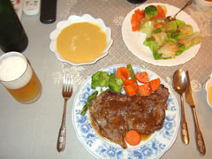_ まつ [そうでしたか。たまたま私の行った店舗(その日)がサイアクだったのかもしれません。とにかく、シャリは固すぎ、ネタは半分..] _ 青木 [さすがにそんなに酷くなかったな。さすがにいくら温厚な私でも、半分であってもネタ凍ってたら卓袱台引っくり返すし、家内や..] _ 今村 [遅ればせながら娘さんのお誕生日おめでとうございます。 ウチは7/3に上が6歳になりました。来年はいよいよ小学校です。..] _ 青木 [いや、金なんかいいんです。ここのフッタにもありますが、命(「魂」と実は言いたいのだけど)あればどうにでもなります。「..] _ まつ [よく、子供は2人までが大変で3人目からは段々(子育てが)楽になる、と言いますよね。そんなものかなぁ? とは思うのです..] 2005-06-26 ステーキ焼き焼き。_ OKストアで400円ちょい/100gのビーフサーロインを買う。娘と一緒に晩飯用意。今日のステーキは、肉は高級なので美味いに決まっているのだが、ソースがちょいと酸っぱいかった。肉がかなり味わいのある肉だったので、ソース的には、きわどい線だがぎりぎりセーフでこれはこれで合ってはいたのだが、意図してクリティカルな味を狙ったわけでなく、一歩間違えば失敗作であったものが偶然、救済された点は大変に危険で、充分に反省したい点だ。 前回は、ソースの味はよかったのだが、量が少なめでパンを食すには寂しい感じだったので、今日は多めに作ってみたら、スケールアップ時にバランスが崩れたっぽい。 白ワインビネガーを入れ過ぎたかなぁ。次回への教訓としたい。