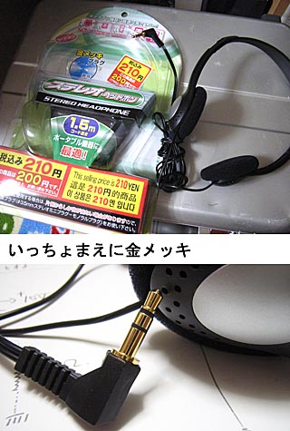 ヘッドフォンアンプを作ることになったのは昨日の日記で書いた通りです。 が、私は今まで(物理的にも聴感的にも)窮屈だっていう理由でヘッドフォンって使ったことなかったのです。ですので、回路の性能評価は信号発生器やオシロで定量観測する一方、最も大切な聴覚による定性評価は、スピーカー駆動によるリスニングと、クリスタルイヤホンによる静的ノイズ評価という方法を採っていました。スピーカーが駆動できればヘッドフォンも駆動できるだろうという考えのもとです。 今日、家族でお買い物に出かけた際に、百円ショップを覗いてみると、なんとナイスなことに、\200-でステレオヘッドフォンが売ってます。ダイソーの\200-のヘッドフォンでアンプの評価つうのもどうかと思いましたが、ないよりはマシでしょうし、取りあえずゲットしてみました。 家に帰って早速試作アンプにつないで、モニタしてみたのですがこれがまた大変に驚きです。 スピーカーで聴く世界とは全く別モノ。ダイソーの\200-のヘッドフォンで聴いた音ですら、回路設計のアラが思いきし表出してきますし、スピーカーではあまり気にならなかった歪感が大変に気になります。はじめは、ヘッドフォンがボロいせいで歪んでいるのか? と思ったのですがそうでもないようです。気になった箇所をあらためてスピーカーで耳を澄まして聴いてみると、確かに歪んでいます。 ヘッドフォンおそるべし。 音響変換器である振動板が耳元直近にあるがために、音がダイレクトに鼓膜に伝達されるってことなのでしょうね。スピーカーでの再生音の場合は、コーン紙からの直接伝播以外にも、部屋の壁などに反射してやってくるマルチパスが多いでしょうから、このへんある意味誤魔化されてしまっているのかもしれません。 スピーカーではかなりゴキゲンに鳴っていた2SC1815 / 2SA1015のサウンドも、ダイソー200円ヘッドフォンの元では荒削りというか、固い、カクカクした感じの音でどうもいただけません。このへん主観、趣味の問題なのでなんとも言いにくいのですが、ピアノの音や三味線の音の立ち上がりがなんともこう濁った感じでよくない感じです。伸びやかさがないというか。 回路設計上の問題もあるかと思いますが、取りあえずヘッドフォンの世界というのは、スピーカーでの再生音とは全く別の世界があるってことを発見して、今日はとても有意義な一日でした。 『スピーカーが駆動できればヘッドフォンも問題ないだろう』という私の考えは大きな間違いだってことがわかったことは収穫です。 しかしなぁ、ダイソー200円ヘッドフォンですらこれなのだから、AGKのK501で聴く音場というのは、どんな世界なのだろう。