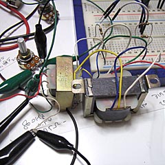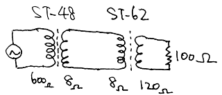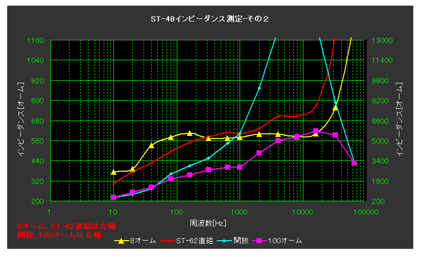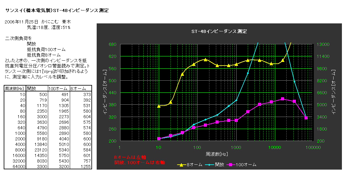 2006-11-26 午後はひとり気ままな休日。_ サンスイ(橋本電気製)ST-48インピーダンス測定。今日は午後から、家内と娘が所用で出かけたので、ひとり気ままにST-48のインピーダンス測定でもしてみよっかなっていうことになりました。 SEPP等の出力トランスが無いアンプであれば、繋がれるであろう負荷に比べてある程度出力インピーダンスを下げておけば負荷のインピーダンスはそれほど気にしないでも大丈夫です。この場合、定電圧駆動に近い動作となります。 ところが出力トランスがあると、どうなっちゃうのかな? ってのが今回ST-48のインピーダンス測定をしてみようと思い立ったことの発端です。 世間が真空管の出力変成器アンプが主流であった時代には、アンプの出力インピーダンスと、繋げるスピーカーのインピーダンスは合わせなければなりませんでした。アンプにも、4オームと8オームの2つの出力を持つものもありましたし、16オームや他のインピーダンスを持つものもありました。ところが半導体のOTLアンプが流行ってくると、アンプとスピーカーのインピーダンスマッチングってあまり気にされなくなりました。これは、半導体アンプはその出力インピーダンスをとても低くできるから、スピーカーのインピーダンスが多少変化しても定電圧で駆動できるようになったからです。ダンピングファクターという言葉が聞かれるようになったのも、半導体アンプからじゃないでしょうかね。だって、出力トランス付き真空管アンプでダンピングファクターなんて言ってみたところで、特定周波数で1.0、可聴周波数帯域内で見れば1未満である帯域も多そうじゃないですか。 そう考えると、ダンピングファクターって一体なんなんだ? って疑問を高校生のころにアンプの自作をしていて思ったことがあります。過去にアキュフェーズのP-20というパワーアンプを使っていたことがあるのですが、このアンプには「ダンピングファクターコントロール」なんつうケッタイな機能が付いておりました。8オームに対して50、5、1 だっけかな。当時私は、FE-207のバックロードスピーカーを使っていたのですが、P-20のダンピングファクターはいつも1で聴いていました。当時半導体アンプの世界では、一般には高ダンピングファクターのほうがスピーカーに対する制動力が高く、音が良いとされており、シグマドライブというケンウッドのアンプで使われていた駆動方式ではダンピングファクターが一万オーバーなんてのもありました。 が、ウチのスピーカーシステムではP-20で比較する限り、どこをどう聴いても、50より1のほうが躍動感溢れる生き生きとした音が出てきたものです。 そんなわけでダンピングファクターは謎なファクターなのですが、それはそれで今日のところはおいといてですね、今回は出力トランスのインピーダンスって、一体なんのインピーダンスなのか? という点を自分なりに納得したくて実験してみることにしたのです。 _ 出力トランスのインピーダンスとはナニ?