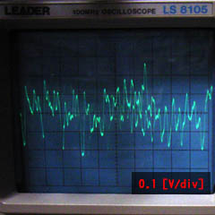 あまりにも計算されたパワーが微弱すぎな気がするので、過去の経験からこの数値を検証してみることにしました。 以前、10F10で実用時の実効パワー測定したときの私の部屋は四畳半。スピーカーから耳までの位置はせいぜい1.5mあるかないかでしょう。計算が面倒なので、1.4mとします。 10F10の軸上音圧レベルは、1mの距離の1W入力で確か 92dB。当時、普通に聴く分には100mW程度という結果でしたので、100mW入力で1.4m位置の音圧レベルは: 92 - 0.7 - 10 = 81.3 [dB] となります。 今回、ダイソーヘッドフォンで、0.156 mW入力で普通に聴く程度の音量ということですから、このときの音圧レベルを求めます。ダイソーヘッドフォンは、98dB / mW ですので: 98 - 8 = 90 [dB] あれ? 全然合わない。そうか、ダイソーヘッドフォンの測定はオシロの管面から本当のピークを読み取っていて、それを正弦波の尖頭値としちゃったから過大評価されているのか。実際の音楽信号は正弦波ほど連続したパワーレベルを持っていないのです。 オシロの波形から、えいやっ! で、ピークと実効値の比を 8 としてみます。ちなみに正弦波の場合は 2.8 です。 改めて計算。 98 - 17 = 81 [dB] ぉおおほぼぴったりだ! って、つじつま合わせているだけじゃないのか? というツッコミをもらいそうな論理展開ですが、これについてはまた後日、実効パワーをなんとか測定する方法を考えて、追試したいと思います。 でもマジメな話、今回の推論は結構いい線行っていると思いますよ。下のオシロの管面見ても、ピークって本当に突出していますよね。このピーク部分を読んでヘッドフォン使用時のヘッドフォン入力パワー計算しちゃったのがそもそもの間違いですかね。 そうか。1KHzぐらいの正弦波を入れて聴いてみるって手はありますね。 以上、11月29日10時追記: