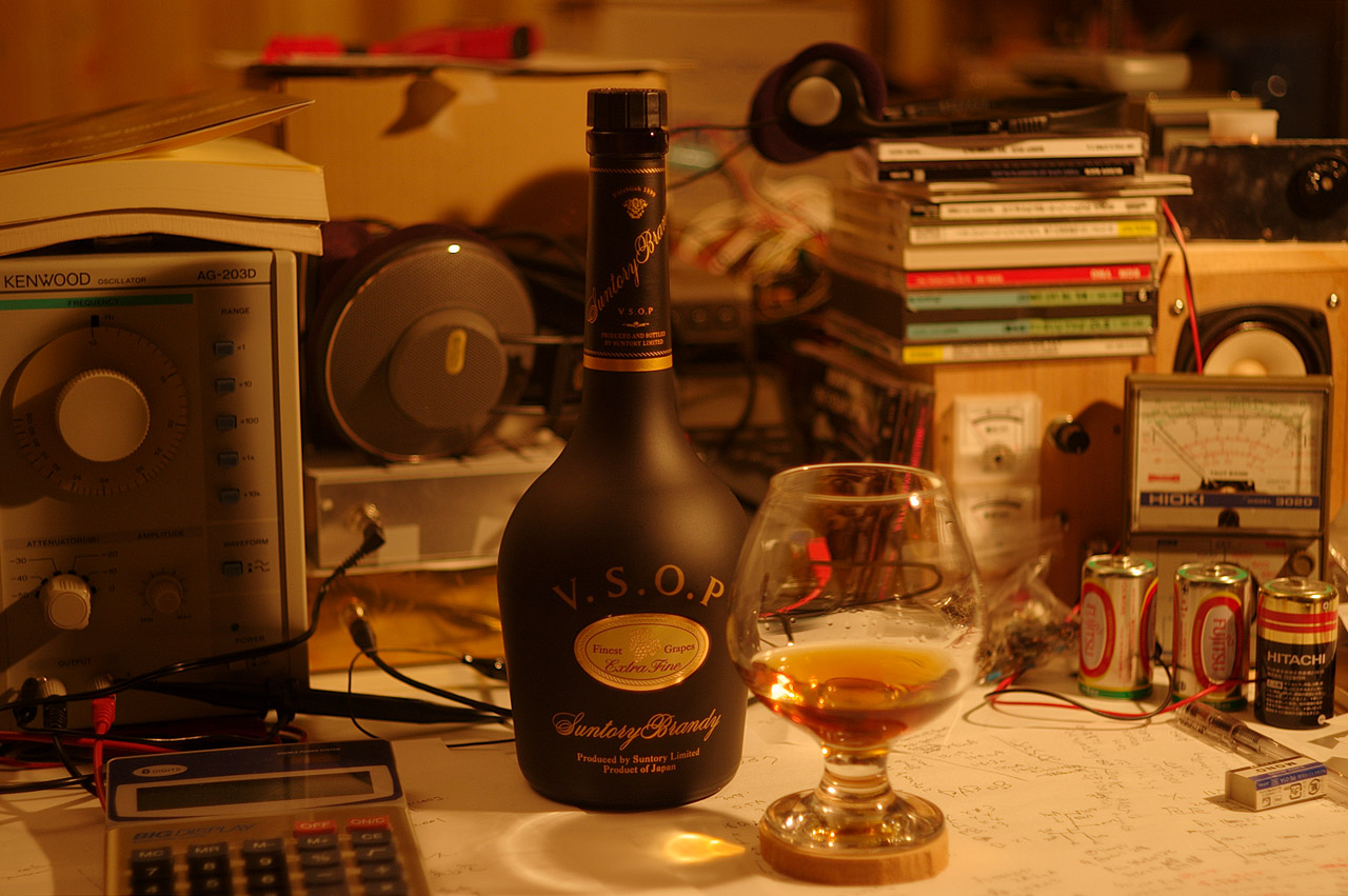 2007-02-20 清く正しくオッサン街道まっしぐら。_ ブランデーデビュー。外で飲むときにはね、たま〜に、深夜のショットバーやラウンジで、血迷ってヘネシーを頼んだりすることはあっても過去の比較的長い酒人生において私は、いまだかつて自分でブランデーというものを一本も買ったことがありませんでした。 先日、オッサン臭いということで敬遠していたサントリーローヤルを買ってみたらばめちゃくちゃ美味かったって話をしましたが、なんかね、ブランデーってローヤル以上に若造に似合わないですよね。私がブランデーに持つイメージつうのは、マフィアのボスが大都会の超高層マンションの最上階のペントハウスで、めちゃくちゃ深いソファーに腰掛けながら膝の上にはペルシャ猫。そして、熱帯魚の水槽眺めながら「ぐびっ」ってやる酒って感じなんですよね(完全に映画の見過ぎです)。そんな貫禄は皆無な私がブランデーなんてね、笑っちゃうよって感じだったんです。そんな貫禄は未だに皆無なんですが、幸いなことに年齢だけはほっておいても自動的に積算されていくわけで、ここはひとつ時の流れの恩恵を受けようかなと。 もうね、私も本厄ですしね、充分にオッサンなわけですよ。で、自室でブランデー飲んでもバチあたらない歳になったかなって気もあってですね、思い切って今日買っちゃいました初ブランデー。まさにオッサン街道まっしぐらです。 初めて買うブランデーをなににするかは結構真剣に悩みます。自作アンプに(オシレーター以外の信号で)初めて聴かせる音を何にするか? 新品で買ったヘッドフォンにはじめて聴かせる音楽は何にしよう? と同じかそれ以上に悩むものです。 ま、なににしたところで、なにがどう変わるってわけじゃない、どうでもいいことなんですが、どうでもいいことだからこそ真剣に悩むわけです。 で、結局買うことに決めたのは、サントリーのVSOP。まぁ、庶民ブランデーの定番ですかね。私はウイスキィはサントリー派、たま〜にニッカって感じでサントリーはかなり贔屓にしています。だからってこともあるのですが、自分で買う初ブランデーはぜひ国産にしたいという気持ちもあってですね、これにしました。外では平気でヘネシー飲んでいたりする私ですが、いざってなるとソレナリにこだわります。 さて、購入品目が決まった次に問題となるのは、グラスです。 今まで自宅でブランデー飲むことなんか皆無だったので、ブランデーグラスなんかありません。そんなにね、ブラントとか、形に拘る私じゃないのでワイングラスでもいっかな? とも思ったのですがここはひとつ、ブランデー記念日ってこともあって近所で525円(消費税込)のブランデーグラス買ってきました。 ブランデーグラスは薄いほうが体温伝わりやすくて云々なんつう能書きを全否定するかのごとくの貫禄ある気さくなグラス。たいそう気に入りました。 で、自室で一杯の図です。 あんまし気合い入れすぎちゃって、R-D1で撮っちゃいましたよ。レンズはいつものロッコールM40mm/F2で開放です。さすがにリンク先の画像は縮小してますが、それでもR-D1の気迫はPCのモニタ越しにでも充分伝わっていくことと思います。 さてと、今宵、リラックスタイムとしますかね。 本日のツッコミ(全2件) [ツッコミを入れる]