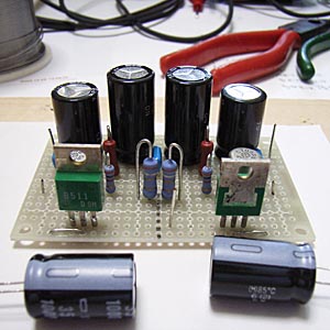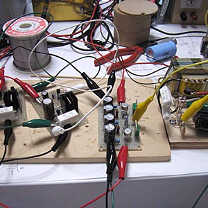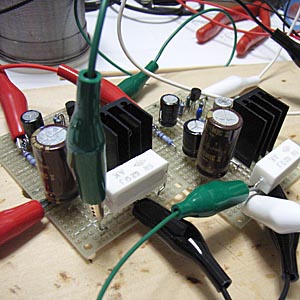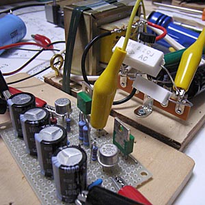 まずはじめに、ケース実装の関係で当初の計画通りではどうしても格納できなくなってしまった電源平滑部のコンデンサを小型のものに換装。 写真の四本そびえたっているコンデンサの真ん中の二個がそれ。この写真は換装前。容量そのままで耐圧を35Vに低くし、両端のものと同じサイズに変更。容量そのままなので回路的な動作に影響は無いものの、このコンデンサは電源回路からやってきたばかりの直流を受けるところなので、余裕をもって本当は50Vで実装しておきたいところ。しかし設計上ではここには最大でも25V程度までしかかからないはずなので、まぁいいかってことで、35Vに。容量を減らすわけにはいかないからね。 電源部の改造が完了後、次は各ユニットをバラックで配線し、実際に通電してみて各部の電圧が設計値どおりになっているかを確認する。 今回は、実装状態での動作試験なので、実際に電源トランスを使ってAC100Vから通電する。 何度作っても緊張するこの電源オンの瞬間。