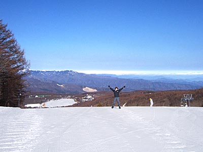 3月24日朝いちのゲレンデから女神湖を眺める私。