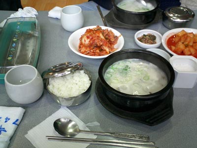 名前がわからなのだけど、とっても美味い。さっぱりしすぎていない、かといって全然コッテリもしていない、程よい油が出たスープの中に、マルタイ棒ラーメンの麺のようなもの少々と、具が入っている。このなかに、ご飯を入れて食べるのが韓国流とのこと。「でも日本の人はこのなかにあまりご飯入れないね〜」とはケアしてくださっている商社のかたの話。私は地元流に、このなかにご飯を入れて食べてみた。塩コショウでおのおの勝手に味を調整する。 これがね、激ウマですわ。 「これって豚骨?」「いえいえ、牛の骨。韓国は豚骨はスープ取るのに使わない。牛の骨」とのこと。 どんな料理でも必ずキムチが出てくるのはさすが韓国。これまた美味いのでついつい食べてしまう。 本日のツッコミ(全5件) [ツッコミを入れる]