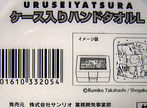 娘を連れて行ったにもかかわらず、完全にカブりスパイラルに突入です。 10回クジ引いた結果は・・・ ・クリアファイルセット x4 ・ラムのクッション x2 ・チェリー達のハンドタオル x2 ・ラムのハンドタオル x1 ・じゃりテンのマグカップ x1 でした。結局コタツネコご招待は叶わず・・・しかし男は引き際が肝心。 楽しかったです。 _ なんと! サンリオが。今回の一連のうる星やつら当たりクジグッズ、『どこが作ってんのかな〜』なんて気楽な気持ちで裏を見てみたらなんと! 発売元サンリオだったのです。手元にあるクッションとハンドタオル、クリアファイルセット、マグカップ全部がサンリオ。 あのキティちゃんのサンリオです。うる星キャラの権利を買ったんですかね。それともたんなる業務委託?