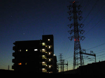 持っていたデジカメがリコーのCaplio 近くに都合よい電柱とか壁などが無かったため、道のはじっこに立って、まさに素の手持ち撮影です。 ISO800で1/5秒。『手ぶれるかな〜』って思ったのですがさすが私です ^^) まったくぶれませんでした。まだまだ術は落ちていないようです。 ビルの上に光っている点が金星です。HotPixelではありません。