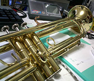 2008-11-28 寒い雨の朝。_ 全く鳴らない。早速朝からトランペットをいじってみました。 思えば過去に自分用の楽器を持った経験は、小学生時代のカスタネットやリコーダー、ハーモニカ、ピアニカ等を除けば、オカリナとカシオの片手で掴めるサイズのミニキーボードぐらいなものです。 予想通り全く鳴りません。たま〜に「ぶひひぃぃー」みたいにヘンなカスレ音が出る程度。トランペット奏者つうのは、よくもまぁあんなに綺麗に吹けるもんですね。 たった10分間程度の格闘で唇と腹筋が疲労困憊です。 たま〜にマグレで「ほら貝のラッパ」みたいな音が出ると、あまりにも爆すぎる音が出ます。 これは家では練習不能だなぁ・・・ というか、現状はトランペット本体を使う以前の問題です。 呼吸法は幸いなことに歌を歌うときと一緒だというので、ここは昔、合唱団時代の経験が活かせるところです。 しばらくの間は、マウスピースだけで綺麗に「ぴーぷー」鳴らせるようになることが、目標でしょうか。 近所の河原で練習するにも、ある程度は音が出るようにならないといくらなんでもねぇ・・・ サスケのOP吹けるようになるまで一体何年かかることやら・・・