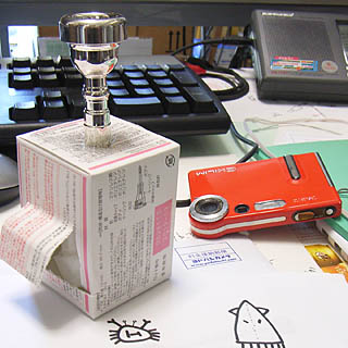 2008-11-29 よい天気の朝。_ トランペット練習治具。今日は朝からとてもよい天気。富士山がよく見えます。 さて、暇さえあればマウスピースを「ぶびぶび」吹いているここ最近ですが、ちょっとした治具を作りました。治具ってほど大げさなものじゃないのですが。 少し汚い話になってしまうのですが、マウスピースを吹いていると、吐く息の中の水蒸気の凝結水と飛び散った唾液が管のはじっこ(通常はトランペットの中にささっているところ)から垂れてくるんですね。ティッシュで拭き拭きしながらやっていたのですがどうもそれも面倒なので、写真のように小さな空き箱を利用して、簡単な「受け箱」を作ってみたのです。 したらばこれが案外面白くて、ちゃんと音が鳴るんです。 こんなんで練習したら、なんかヘンなクセが付きそうで怖い気もするのですが、音も小さいしそこそこ共鳴するしで、部屋で練習するにはまさにうってつけ。面白がって吹いてます。 これで、ドレミが出来るようになれば、大丈夫ですかね? 肝心のトランペットのほうですが、音階はまだ無理ですが一つの音を10秒ぐらいず〜〜〜っと吹いていられるようには、なりました。オシロで波形を見てみると、1010Hzぐらい。BとCの間ですね。なんか中途半端なヘンな音ですが、今はそんなことよりも楽器になじむことが先決だろうということで、トランペット本体を使った練習は、出やすい音を安定して吹けるようになることを目標にやってます。 毎日最低でも30分間の練習時間を確保すべく、日課に組み込みました。 しかし疲れます。深く呼吸して、10秒間吹く〜〜〜〜 を繰り返すと、頭がクラクラしてきます。