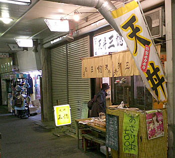 2008-12-19 江戸前ハゼ天を食う会 in 天丼 三惚(川崎大師)_ 子供のころの思い出。私は、大学卒業して社会人になるまでの間、神奈川県川崎市は国道15号線沿い、六郷橋から程近い場所で生まれ育ちました。 小学生のころは、父親とよく多摩川・・・六郷橋から大師橋あたりの間・・・に、ハゼを釣りに行って、釣ってきたハゼを天麩羅にして食べたものです。 特に11月ぐらいになると、白身魚特有の淡白な味のなかにも、ふわっとした歯ごたえとほどよく油の乗った食感がたまらなく美味かった記憶が残っています。 そんな子供のころの記憶をふと思い出し、『そういえばハゼ天を食おう!』と思い立ったのは今年の春のことでした。 江戸前ハゼといえば羽田。春にハゼは無理か? とも思ったのですが、思い立ったが吉日、今年の4〜5月にかけて、羽田界隈の小料理屋さん何軒かに足を運んでみたのですが、いずれもハゼにはありつけず。 春先にハゼを食おうと思うこと自体無理があるのですが、『秋になったらありますかぁ?』という私の質問に対する返答は、「最近羽田でも採れないんだよね〜。だから秋になってみないとわからないや」。 そして迎えた今冬。今度こそハゼ天を食うんだ! と思いたち、Google等でさんざん調べた結果、川崎大師に江戸前ハゼを出してくれるお店があることを発見しました。 『天丼三惚』。早速お店に電話してみますと、「ハゼ? ありますよ。今の季節ならいつ来てもらってもありますあります」。 おー、やったぁ! というわけで本日、私が役員時代の元部下2名を引き連れて、『江戸前ハゼ天を食う会』が、開かれました。 京急大師線の川崎大師駅から徒歩もう1分ぐらいでしょうか。なかなか味のある佇まいを見せるお店の目印は、大きな「天丼」ののぼり。