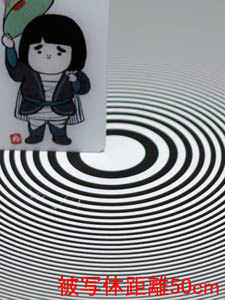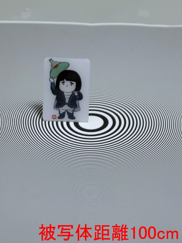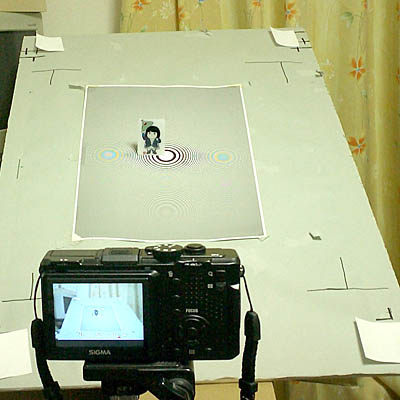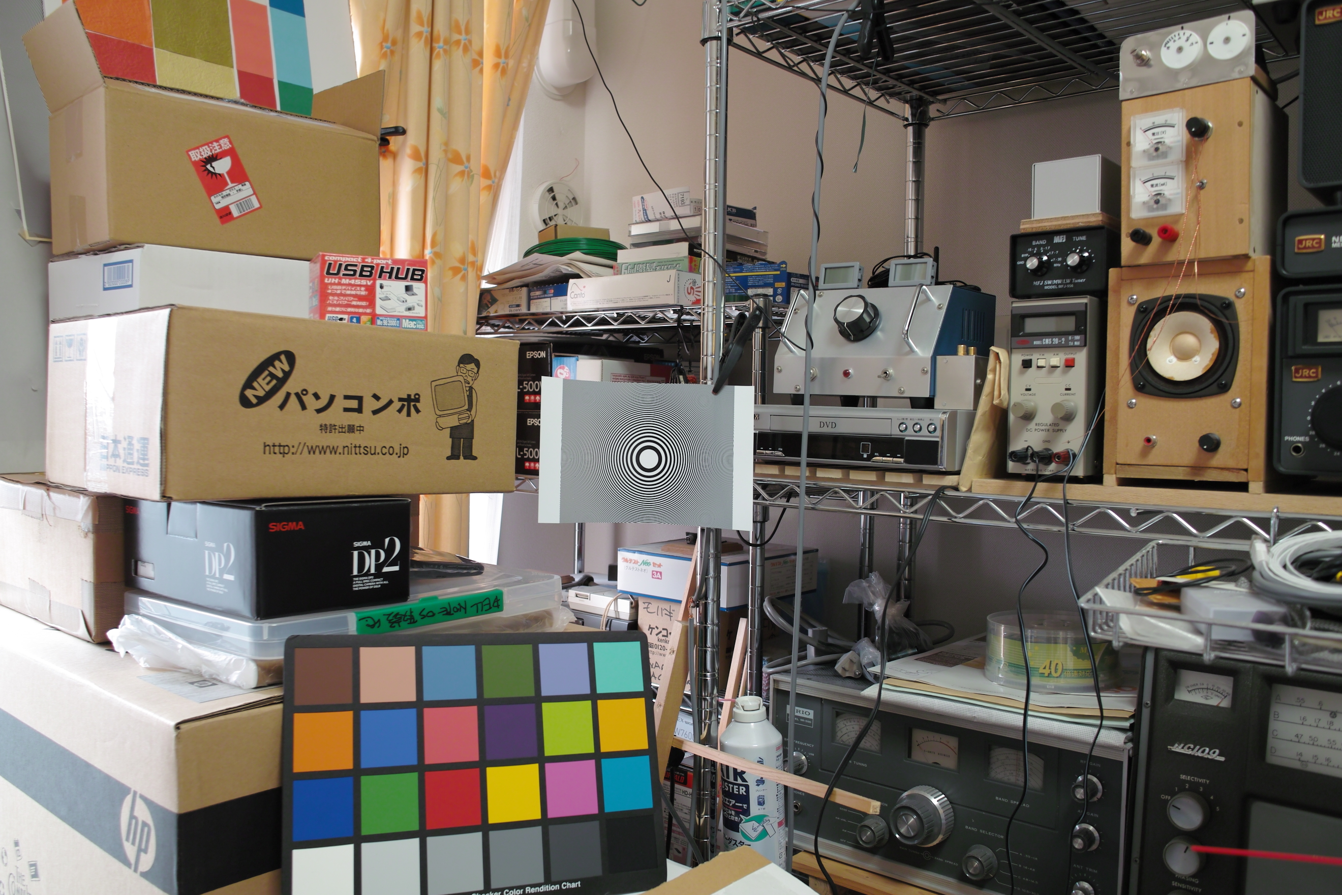 実験風景はこんな感じ。 実験は簡単です。インチキCZPチャートを傾けて撮影し、インチキCZPチャートど真ん中からの距離をメジャーで合わせて、MFを当該距離に設定して撮影するというもの。測定点を明示するために、ゆきぴゅーマグネットに友情出演していただきました。 余談ですがDP2には(DP1もですが)MF時にライブビューを拡大表示して目視で合焦を確認できるインターフェースもあります。これを用いればより確実にMFできるわけですが、しかし、目視で合焦確認できるぐらい時間的にも環境的にも余裕があるのであれば本来AFで済ませてしかるべき状況とも言えます。 今回の実験の目的は、『カメラに1mの位置にピント合わせろ! と指令した際に、実際本当に1mの位置にピントが合うのか?』 ということを検証することにあります。 DP2にはセンサー位置を示すマーカーはありませんでしたので、なんとなく雰囲気でボディー前面から1cm入ったところを、センサー位置としました。よって、例えば被写体距離100cmの時は、カメラボディー前面からゆきぴゅーマグネットまでの距離が、99cmであるということです。 撮影条件は、絞りは当然開放のF2.8、ISO100、露光はAEで出た目のまま。三脚据付でセルフタイマー10秒での撮影です。 MF距離は、50cmと100cmで撮影してみました。135フィルムで41mm相当のレンズで、F2.8で50cmつうと相当被写界深度はシビアです。これで、50cmと100cmで問題なく距離精度が出ていれば、まぁ全ての距離域で問題ないと言っていいでしょう。 以下のサムネイルに、撮影画像からピクセル等倍で切り出した画像をリンクしておきます。 実に綺麗な周波数減衰特性です。なんて全然関係ないところに感心してしまったり。 どうですかねみなさん? いや〜、ほとんど問題ない。というか、実用上まるで問題ない精度は出ていると思うのですが、本当にほんの気持ち、前ピンですかね? センサー位置が実はボディー前面から2cmぐらい内側というか、手前だったとかいうオチなんでしょうか。気持ち前ピンな感じがしますが、実用上全く問題ない精度が出ていると、私は判断します。 DP2を擁護するつもりは全くないですが、絞って生じる被写界深度の増分は合焦面から奥により伸びてゆきますので、どっちかって言えば気持ち前ピンにしておくことは理にかなっているとも言えます。 いや〜、たいしたもんです。 ちなみについでにDP1も一緒に検証してみたのですが、DP1はDP2に比べてより広角でありかつ、開放F値も4.0ってこともあってですね、全く問題なくジャスピンでした。 [ツッコミを入れる]