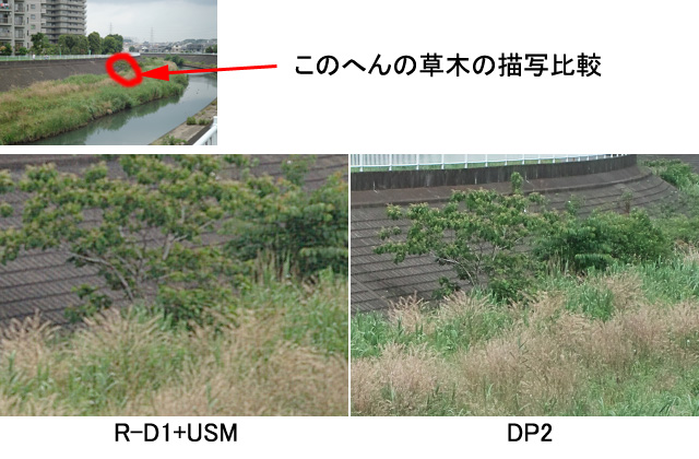 草木のように先がだんだん細っていって尖った部分の描写は、DP2はまさにそのまんま描写されていますが、R-D1はUSMをもってしても、持って生まれた性(=ベイヤー配列が故の補間処理)から逃れることはできません。 2009年6月2日 09:05追記 2009年6月6日 12:07追記