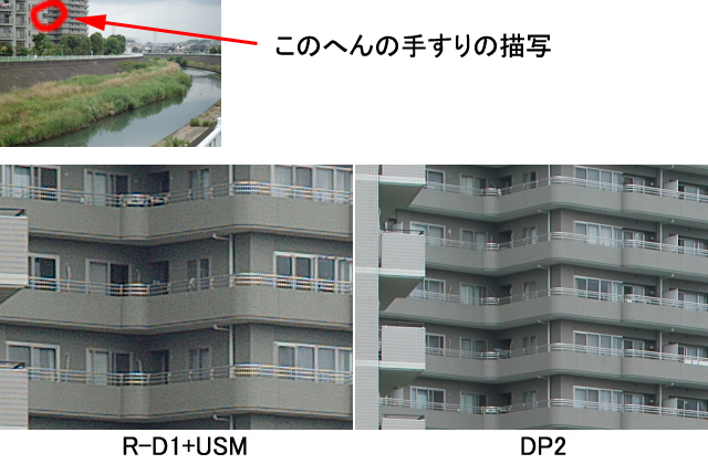 R-D1にUSMかけた画像と、DP2画像を比較してみますと、R-D1もベイヤー配列というハンディを背負いながらもかなり健闘していることがよくわかります。いや〜、R-D1、がんばっているじゃありませんか。ここまで描写できればベイヤーとしてはたいしたものだと思いますがしかし、フォビオン機の画像を見てしまった眼にはどうしてもベイヤーならではの破綻が見えてしまいます。 こうして改めて見てみると、DP1のレンズも相当いいですね。もっと使ってやればよかったなぁ・・・DP1。