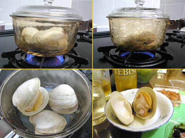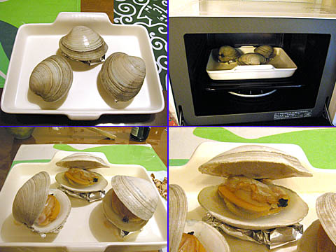 私はオーブントースターでいろんなものを焼きます。干物、あさり、蛤、小さい筍その他もろもろ。今回のホンビノス貝も、まずはオーブントースターで焼こうかと思ったのですが、あまりのデカさに殻が開くとオーブントースターの上部発熱体に接触してトースターを破壊しそう。 よって已む無く、オーブンレンジで焼いてみることにしました。 240度に設定してとりあえず15分間ぐらい。 したらばこれが予想以上に手強い。全然殻が開きません。時間延長を何度も繰り返し、なんと、30分間ぐらい加熱してやっと、やっと開いてきました。 う〜む・・・このホンビノス貝、殻があまりにも肉厚で丈夫すぎるためか、相当な熱量で一気に加熱しないとだめみたいです。 『こんなにタラタラ加熱したんじゃ、身が硬くなっちゃったかな?』という予想は見事的中。味はなかなかイけてそうな感じであるも、身が硬くなってしまい食感は最悪。これは完全に調理失敗と言って良いでしょう。 次回は酒蒸しにしようと、固く心に誓います。 _ その2:酒蒸しにする。さて今晩。 使い古しの歯ブラシと塩水で綺麗に洗ったホンビノス貝を鍋に入れ、私がいつも飲んでいる純米酒を90mlも投入し、一気に強火でフル加熱開始です。 純米酒のアルコール分が鍋の蓋から漏れ出し火が付いて『ぼわっ!』とか青白い炎が立ち上がりますが、怯まず加熱継続です。 5分間ぐらいフル加熱し続けると、貝が少し開いてきました。と、同時に貝の中にあったエキスが流出したのでしょうか。鍋の中が一気に泡ぶくなってきて『どわっ!』と鍋の蓋を押し開けて一気に吹きこぼれてきます。レンジ台はもとよりその内部までもう滅茶苦茶。しかし怯まず火加減を微調整しつつ加熱を継続。全部の貝が開いた瞬間に火を停止し、数十秒、蒸らします。 うむ。今日は昨日よりも見た目は随分いい感じな出来です。貝の肉の艶が全然違います。 家族3人分を皿に取り分け、早速食べてみます。 身を丸ごと口の中にほおばり、噛んでみると『じゅわっ』と、エキスが出てきます。うむ? 美味いぞ。実にジューシーで美味しいです。 速攻で日本酒を口にします。なかなか美味いです。食感もやわらかでなかなか良い感じ。少なくとも昨夜のものとは別物です。 あれですね、この、ホンビノス貝。貝全般に言えることですが特にこのホンビノス貝については、加熱し過ぎは命取りです。強火で一気に加熱して、殻が開いたら即食うというスタイルが最高に美味そうな感じ。とはいえこんなにも巨大なので、『本当に火が通ったのけ?』という不安もつきまといますが、まぁ、蓋が完全に開けばとりあえずOKってことでよさそうです(保証はできません。あくまでもown riskで!)。私は少し心配だったので、殻が開いた後、30秒間ぐらい蒸らしましたが。 そういう意味では、火をじっくり通すオーブン焼きには全く不向きな貝だと思います。どうしてもなにかの料理の具材としてオーブンで焼きたいのなら、あらかじめ蒸しておいて下ごしらえしておき、オーブンでの加熱は最小限度にとどめるべきでしょう。 実際食べた感触からするとこのホンビノス貝、今回やったような酒蒸し、あるいは、今回はやってみることができませんでしたが網焼き等の直火加熱調理が向いているように思います。すなわち、『強火で一気に加熱して、殻が開いたら即食う』です。 なかなか面白い貝でした。