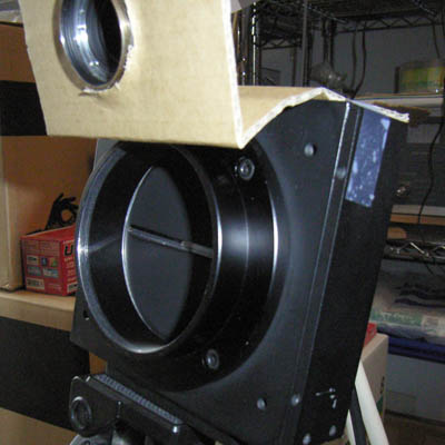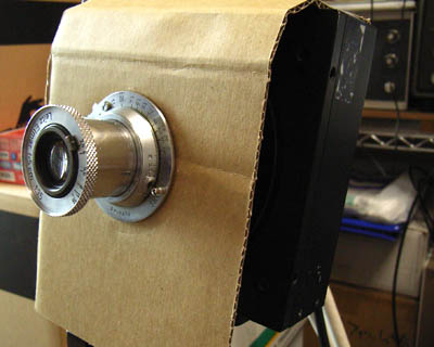 とりあえずこの不気味なものをご覧あれ。 由緒正しいライカのエルマー50mm/F3.5レンズを、急ごしらえで作った段ボールスクリューマウントユニットに装着の図。