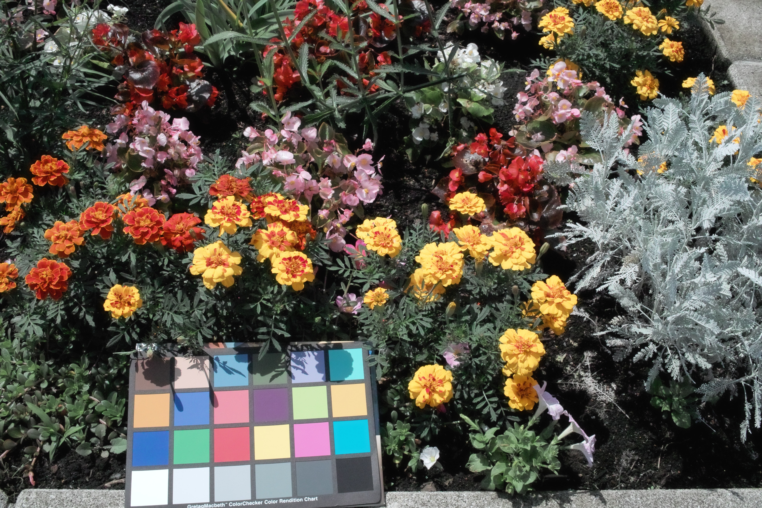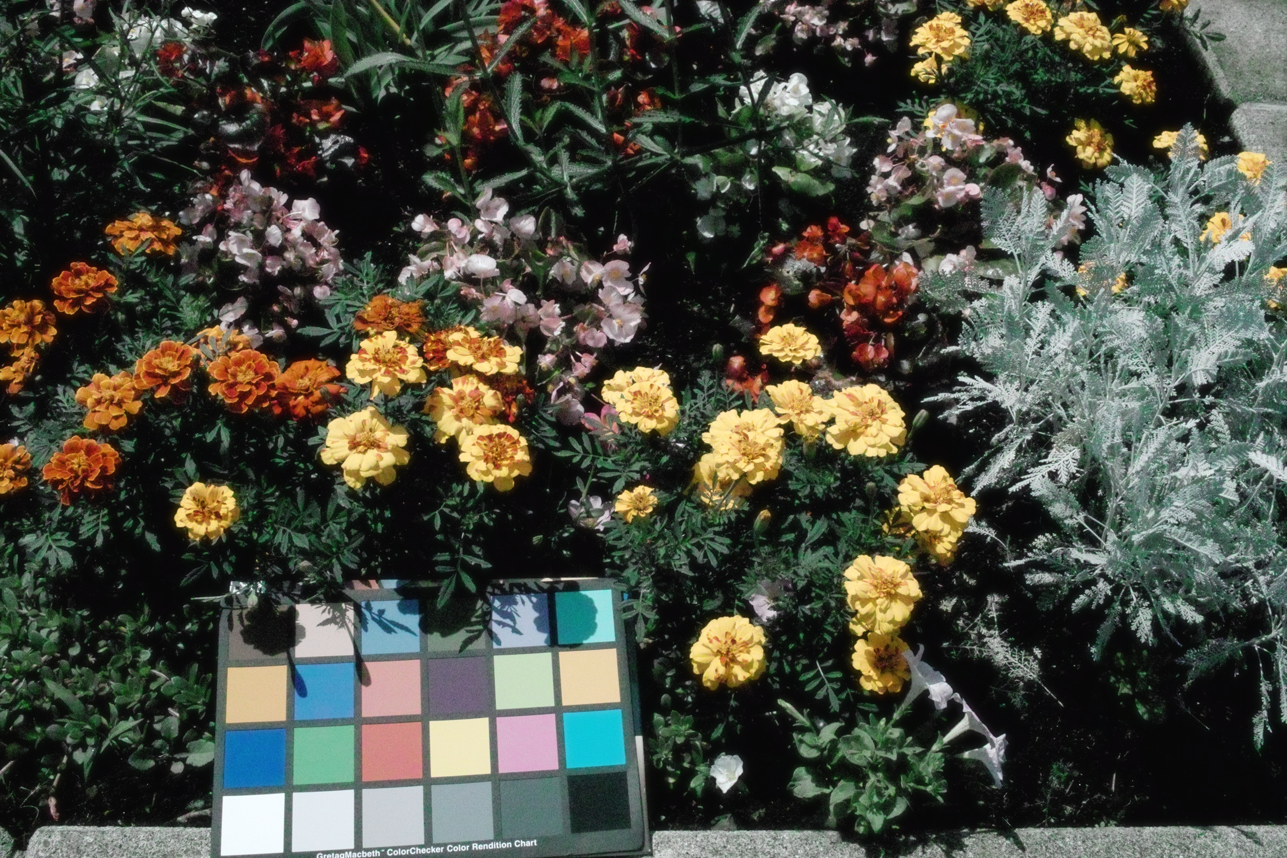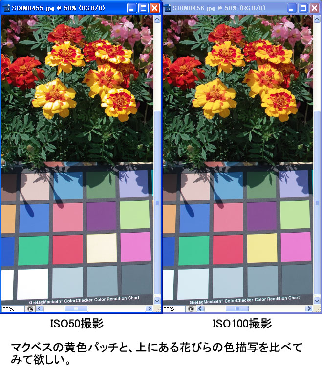 マクベスの黄色の彩度と、マクベスの上にある黄色いお花の花びらを見てみてください。『なんじゃこりゃぁ・・・』 って、感じです。はじめは現像ソフトの設定を疑ったのですが設定は問題無し。カメラ内で画像生成されているRaw画像ファイル埋め込みのJPEGサムネイルでも同じ現象が確認できますので、これはどうやらフォビオンセンサーの特性のようです。 ISO50の画像、マクベスの黄色を見れば色のノリが異様に薄いので異常に気が付きますが、もしこれ、マクベスが無くて、しかも比較画像無しでISO50でしか撮ってなかったら、黄色いお花の色抜けも、太陽光の反射かなにかのように見えてしまいさりげなく気が付かなかったかもしれません。危なすぎるぞこのトラップ。