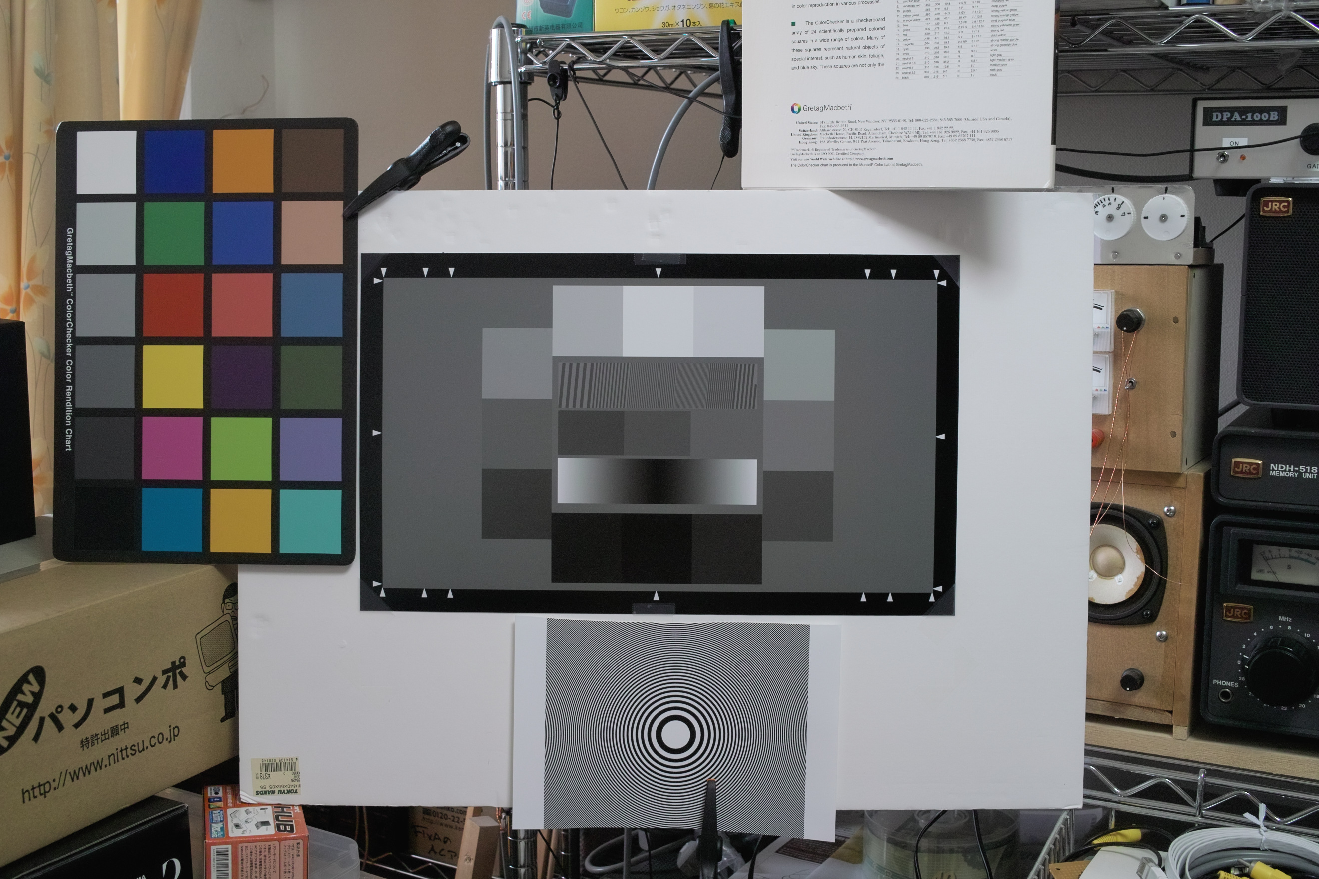 左図が、ISO12233解像度チャートです。これを基本的には上下の幅を合わせて撮影することで、その撮像系の解像度を定量的に評価することができます。まぁ、アスペクトの定義が滅茶苦茶なデジカメでいったいなにをどうしろと? という話もありますがまぁそこはおいといてですね、ISO標準に則って調べてみました。 測定結果は通常「TV本」という単位で示されます。黒と白とが交互に入れ替わる縞々模様を写した際に、どこまで細かくこれを再現できるかということを示します。黒と白をそれぞれ1本と数えます。すなわち、黒白ペアで2本になります。例えば垂直解像度であれば、水平線がどれだけ細かく記録できるかを示します。 例えば、画像の画素数が 横2640 x 縦1760 Pixel であった場合、垂直解像度の理論的最高値は、1760本になります。これは、1ライン毎に黒と白を引いた場合の値です。1ラインが最小描画単位ですからね。 で、今回、DP2の解像度を測定してみたのですが・・・比較のために、エプソンR-D1にいろんなレンズを付けたものも合わせて撮影しました。 撮影は全部rawで撮って、それぞれの現像ソフトで現象しました。現像設定は、全てAUTOです。撮影条件は、以下の通り。