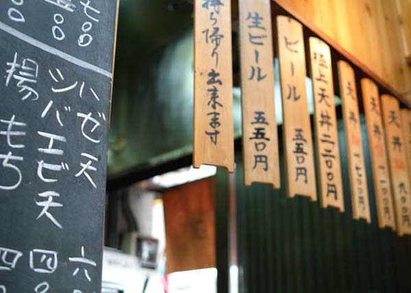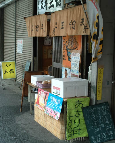 前回、あさり丼(700円)というのが大変気になったので今回はその あさり丼 を食べるつもりで。 店先に出ているメニュー(?)を見る。あさり丼は700円なのに、あさり天丼なるものは500円とある。この両者の違いは何? あさり天丼とは、あさりの天婦羅丼なのか、あさりと天婦羅の丼なのか、はて? やはり700円のあさり丼のほうが偉いんだろうなぁ・・・などと悩みつつ店内に。 いざ、店内に入ると『やっぱハゼ天も食いたいなぁ』。 とはいえ今はハゼは完全にオフシーズン。いや、ひょっとすると釣れ始めごろか? いまどきあるのかな? と思いふと見上げれば黒板に思い切り『ハゼ天』(600円)と。 う〜む、江戸前天丼を頼めばこのハゼ天が含まれることはすでにわかっているので、ここで、 『あさり丼 vs 江戸前天丼』 の戦いが私の脳内で激しく展開される。 う〜むうむうむ・・・どうすべきか? 『んん? そうか! 両方頼めばいいんだ!』 というシンプルな解に行き着くまでにそう時間はかからなかった。 『あさり丼と、ハゼ天お願いします!』 「はいよっ!」 しかし、あさり丼ってどんなものなのだろう。想像するに、酒蒸しみたいにされたか、あるいは、醤油かなにかで煮込んだようなあさりが、ご飯の上にどばぁっとかかっているようなものを想像していたのだが、出てきたものはまるで想像とは異なる食べ物であった。