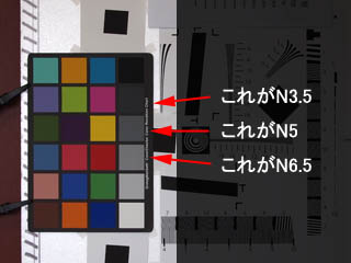 ISOのノイズチャートも持っているのですが、あれ、表面が半光沢で外光が反射して扱いが少し難しいのですね。そこで今回は、マクベスを使ってノイズ量を測定してみました。 N6.5、N5、N3.5のパッチの輝度の平均と標準偏差から、S/Nをデジベルで求めます。すなわち、S/Nの値が大きいほど、ノイズが少ないということになります。