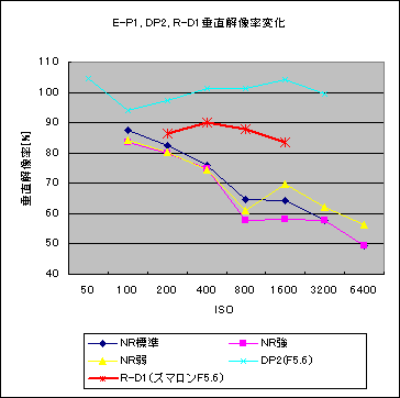 さてお次はE-P1の各高感度NRモードと、シグマDP2、エプソンR-D1のノイズ量比較です。N5パッチのデータのみ抜き出してみました。 DP2はE-P1の高感度NR標準よりも少しノイズが少ない感じ。ただし、ISO400を超えたあたりから急激に崩れだします。フォビオンセンサーじゃじゃ馬ぶり爆発ってところでしょうか。 R-D1はノイズ少ないですね〜。設定可能ISO範囲が狭いとは言え、やはりおっきな画素を持つセンサーは偉い! というところでしょうか。 _ オリンパスE-P1、シグマDP2、エプソンR-D1のISO別解像力変化。