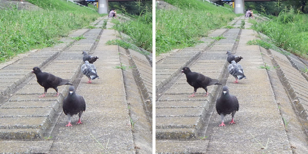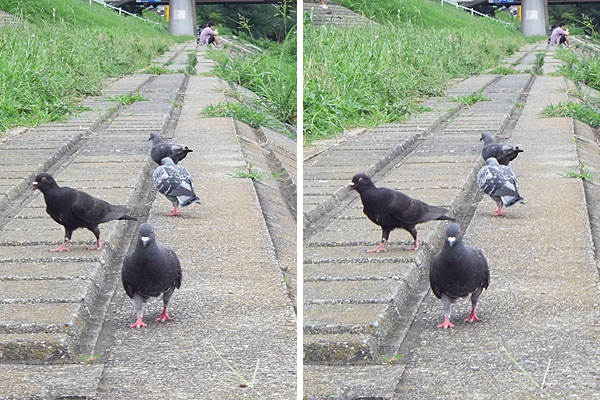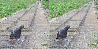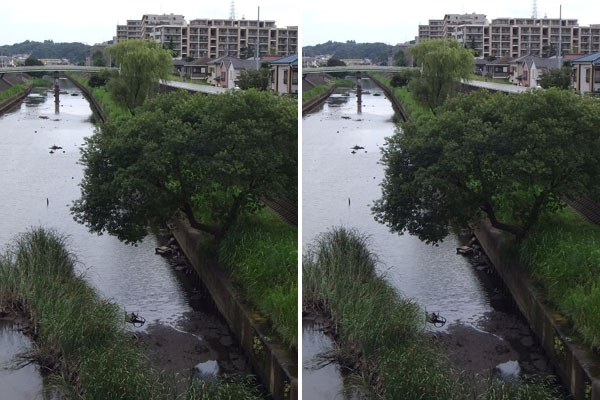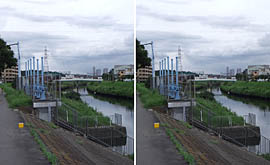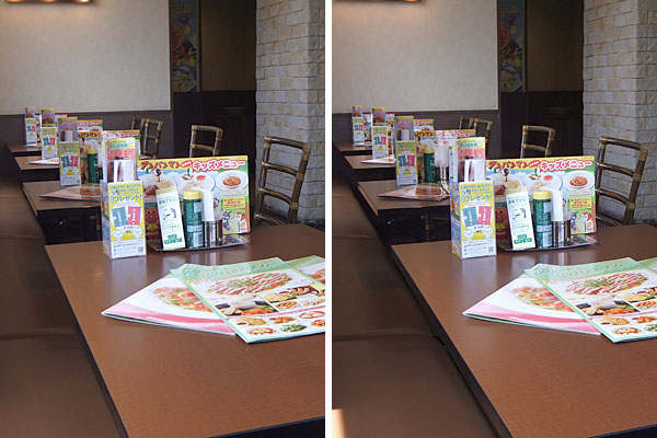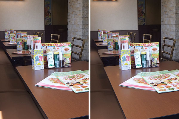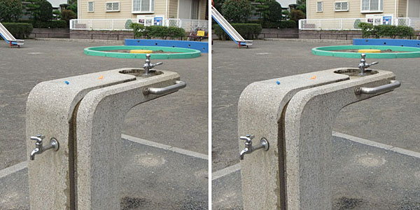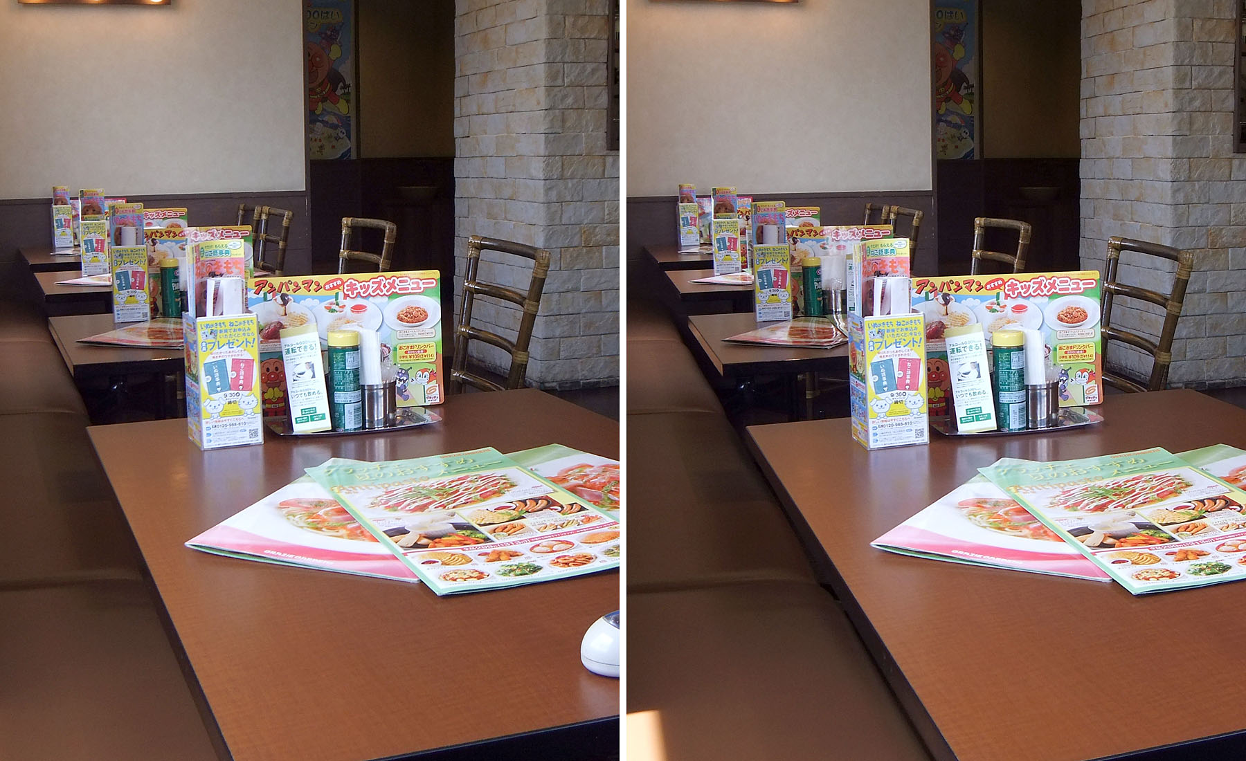 残念ながらPCの液晶モニタでは、当然ですが上記のような液晶表示システムはありませんから、3D画像をお伝えしようと思ったら従来通りの平行法、もしくは交差法などの裸眼立体視に頼るしかありません(赤青メガネの方法もあるにはありますが・・・)。裸眼立体視できる人はよいのですが、できない人は大変申し訳ないのですが、訓練してできるようになってもらう他ないのが実情です。ぜひ、こちらの裸眼立体視入門をご覧いただき、立体視の面白い世界を体験いただければと思います。 近々、赤青メガネの方法も、試してみようかとは、思っております。 というわけで入手2日目ですが、FinePix REAL 3D W1で撮影した作例いくつかご紹介したいと思います。使ってみて感じたのはこのカメラ、ステレオベース(2個のレンズの間隔)がかなり広めで、近距離の被写体だと視差がつきすぎてかなりドぎつい立体視映像が出来てしまいます。今まで普通に裸眼立体視出来ていた私でも、なかなか見えなくて少し焦りました。実はこれ、見えてないのではなく見えているのですが、視差がありすぎて脳内合成でエラーが起きているんですね。もっともきっとこのシステム側は、裸眼立体視されることなどまるで考えてなく、あの謎の液晶モニタでの表示に最適化された状態での撮影だと思いますのでこれについては仕方ない面も多々あります。事実、カメラの液晶モニタで見る限りでは、かなりリアルに立体に見えますから。 その点踏まえてご覧ください。リンク先は全て別窓で開くはずです。