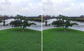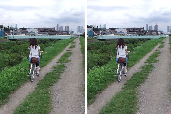 2009-08-09 お盆休み・・・け?_ FinePix REAL 3D W1 はとても楽しい。『富士フイルムの3Dデジカメは、液晶モニタを普通に見るだけでなんで3Dに見えるんですか?』という質問を何件かメールでいただきました。すでに個別にご回答差し上げておりますが、せっかくですからここでも簡単に、説明してみよっかな? みたいな軽いノリで取り上げたいと思います。 ちゃんとした説明は、FUJIFILMさんのWebに詳しく載ってますので、そちらをご参照くださいね。 写真を立体的に見せるためには、右目と左目にそれぞれ視差を持たせた映像を見せて、それが脳内で合成されて立体になるようにするわけです。こちらの 裸眼立体視入門 で取り上げているように、視差を持った組画像を左右に配置して、それぞれ右目左目に別個に入力するようにするのも、そのなかのひとつの方法です。 今回のFinePix REAL 3D W1の背面液晶は、交差法とか平行法とか言われるいわゆる 裸眼立体視 の技を使わないで、左右の目にそれぞれ別個の画像が見えるようにした、特殊液晶モニタを装備しているというわけなのです。 どんな具合なものなのか、簡単に実験してみましょう。