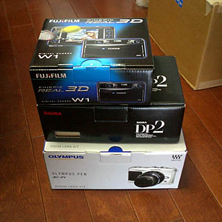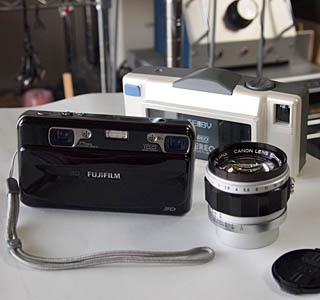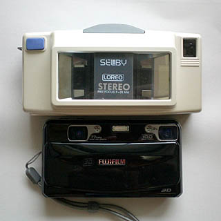 私は実はステレオ写真も結構好きで、この写真にも写ってますが、昔は香港ロレオのカメラで銀塩スナップ撮ったり、風景であれば銀塩カメラで二箇所から撮った写真をあとから裸眼立体視したりして、楽しんでいたんですね。 ステレオ写真って、鑑賞環境が特殊だってこともあって、なかなかWeb等で普通に公開できにくい性質があったもんですから、今までは完全に個人の趣味だったのですが、やってくれました富士フイルム! 今後は、積極的にWebでもステレオペアを公開していきたいと思います。 とはいえこのFinePix REAL 3Dシステムは、鑑賞ベースは専用の特殊液晶モニタです。実は私、カメラ本体とViewerセットを予約していたのですが、なんでもViewerが予想を超える受注で数量確保できず販売延期(8月下旬になるらしい)とのこと。セット予約者はViewerの販売遅延の巻き沿い食らってViewerの販売開始までカメラも入手できないという仕打ちを受けることに。仕方なしにセット予約をキャンセルしてカメラ本体のみ予約に切り替えて本日入手にこぎつけました。 そのぐらい一刻も早く手にしたかったんですよ、このカメラ。 数時間使ってみてのファーストインプレを、早速ご紹介しましょう。