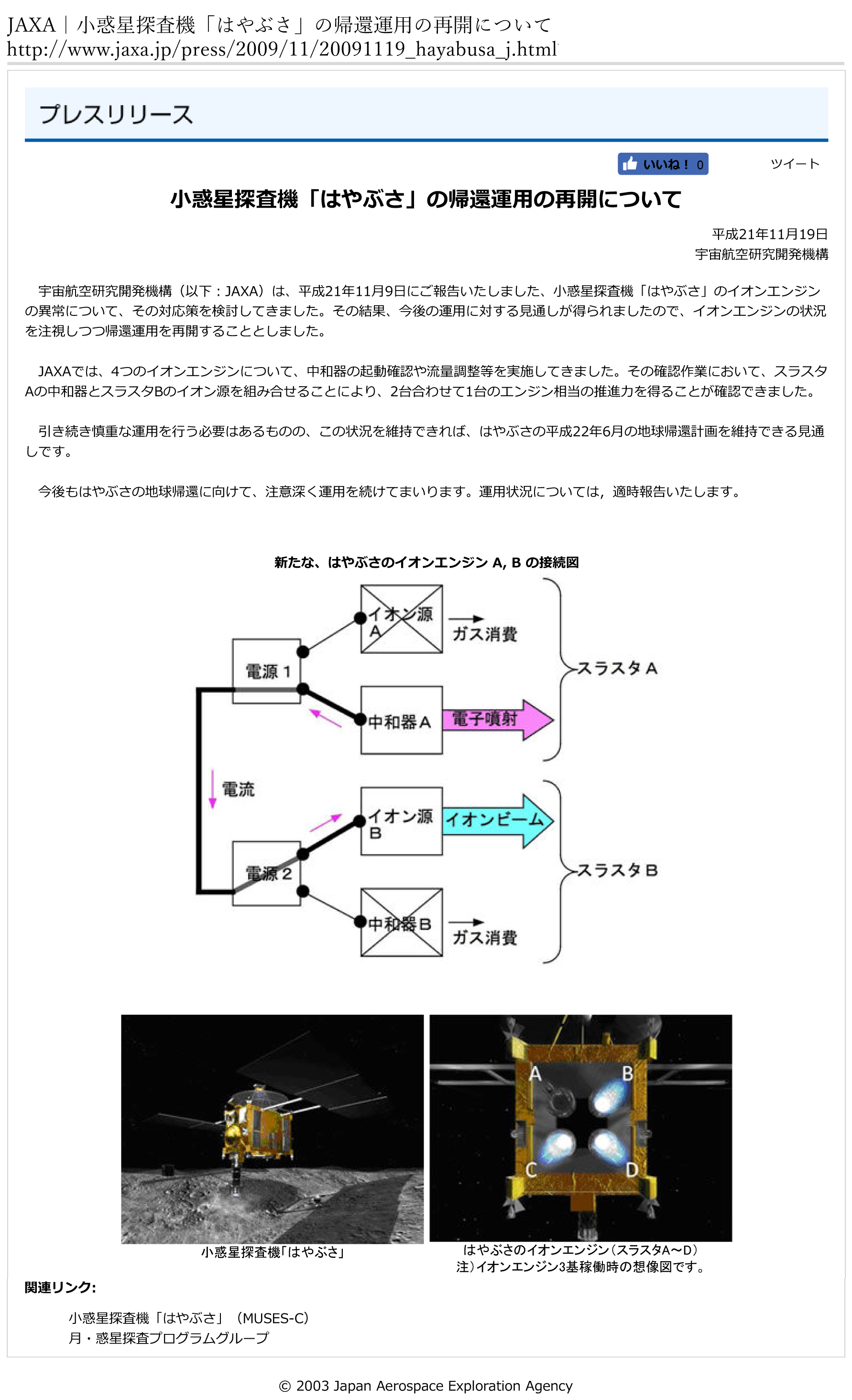2009-11-21 軌跡の生還計画。_ 「はやぶさ」頑張れ!掲示板にも書いたのですが、もうほんとうにこれでお仕舞いか? と思われた「はやぶさ」の致命的トラブル。なんと、まだまだ超裏技は残されておりました。(2019年5月9日追記:リンク先キャプ画像取りました。これ。) JAXAのみなさん、本当に頑張っています。素晴らしい。 今までの度重なる障害をまさに神業的な裏技で解決してきた「はやぶさ」ならびに運用チームのみなさん、頑張ってください。心の底から応援しています。 また、どんな形であれ本ミッション終了したら、ぜひ書籍か映像で、記録として残して欲しいものです。 エンジニアとして生きてゆく上でも、大変勉強になることばかりです。 設計段階で冗長性を入れておくことは当然としても、想定を遥かに上回る障害を今まで乗り越えてきた「はやぶさ」ならびに運用チーム。 全てを知り尽くす、あらゆる手を尽くす、使えるものはあますことなく使う、根性でも諦めない・・・ 見習うべきが多すぎます。 [ツッコミを入れる]