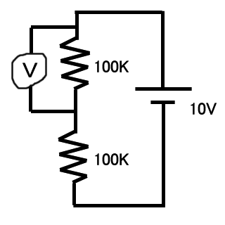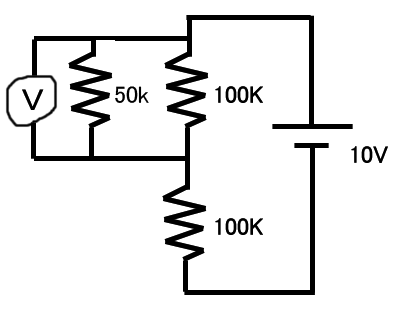 10Vの直流電源を、100Kオーム x 2 で分圧しています。この、片方の100Kオーム両端の電圧を測定してみましょう。 このとき、測定に使ったテスターの内部抵抗が無限大であった場合(あり得ない状態です)、5Vとなります。 しかし、一般的なアナログテスタの内部抵抗は、普及品ですと5Kオーム/Vぐらい。仮に10Vレンジで測定したとした場合、50Kオームの内部抵抗を持つことになります。すると、等価回路は以下のようになります。