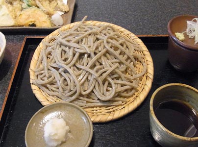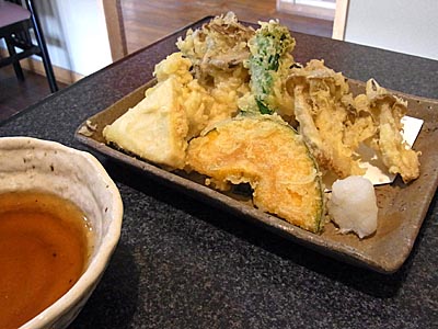 私の注文は、季節の野菜天盛(730円)と、手びき蕎麦とせいろ蕎麦が2枚楽しめるという「らいあん蕎麦」(1600円)。ちなみに、手びき蕎麦単品は950円、せいろ蕎麦単品は700円ですので、セットにすると50円お得という設定です。