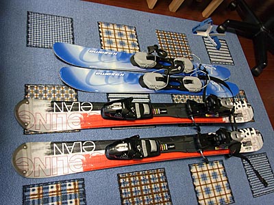 手びき蕎麦について『こんな太いお蕎麦はじめて見ました』という私に女将さんのお話では、手びき蕎麦は松本、野麦峠付近でよく食されるお蕎麦、せいろ蕎麦はここ佐久平近辺でよく食されるお蕎麦とのことでした。 実に美味かった。実に満足な昼食お蕎麦タイムでした。 _ スキーボード新調。思えば7年前の2003年冬、当時6歳だった娘をスキーデビューさせるに当たって私がインストラクトを行いやすいようにと初めて買ってみたスキーボード。近所のアルペンで一番安かったカザマの実売1万円弱のモデルを買ってみたのが私のスキーボードデビューでした。 それまではず〜〜〜っと、長いアルペン用の板を使っていましたから、『娘も一人で滑れるようになったら、また長いのに戻ろう』みたいな感じで、この異様に短いスキーは、いかにも一時的な所謂「お遊び」目線でしか見ていなかったのです。 と・こ・ろ・が・・・ これで実際滑ってみると案外面白い。案外どころか、とても面白い。高速なのにヤケにクイックに曲がれたり、くるくる回れたり、板が短いが故の高機動っていうんですかね、その独特な世界をすっかり気に入ってしまって娘がすっかり上級コースを滑り降りれるようになっても、短いスキーでばかり滑っていたのです。 結局、7年前にスキーボードで滑って以来、長いスキーは一度も使ったことがありません。 というわけで(どんなわけだ?)、この度この短いスキー板を、新調することにしたのです。 二度目の購入となる今回は、少しグレードアップしてみました。 明日からのスキー行でデビュー予定です。 写真手前がおNewの板です。遠近法の関係で、おNewは旧バージョンに比べてヤケに長いように見えますが、実際には9cmしか変わりません。とはいえ、9cmと言っても1割の差ですから、大きいといえば大きいですが。 明日に備えて家族の板と合わせてワックス塗っていると、徐々にテンションupしてきます! して、この、旧スキーボードですが、なんと明日、娘が使ってみることになりました(本人得体の知れないものだということで若干イヤイヤ気味 ^^))。万一気に入らなかった場合に備えていちおう彼女のカービング板も持っていきます。 が、私の読みが正しければ、きっと気に入ると思うんだけどなぁ・・・