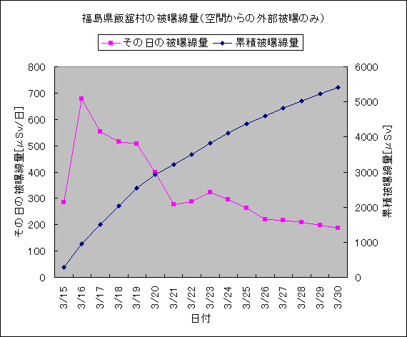 2011-03-31 外圧がかからないと決断できない日本政府?!_ 福島県飯舘村の被曝放射線量について。今朝未明より各方面で報道されている通り、IAEAから日本政府に対して、飯舘村に避難勧告を出すよう通告がありました。 IAEA事務次長から、「IAEA独自の土壌調査で、飯舘村の放射線量はIAEAの避難基準を上回っている」と指摘があったとのことです。 これに対して本日11時頃の日本政府の記者会見で、枝野官房長官はこれを認め、次のように言いました(概要)。 直ちに健康に害はないものの、長期間居ると健康を害する恐れがあるので今後の推移を注視するとともにモニタリングを強化する。 IAEAに指摘される前に日本は独自に調べてないのかとか、いつも後追いばかりでなにやってるんだとかいう非難はとりあえずここでは置いておいて、飯舘村に住んでいる人たちの被曝線量を計算してみました。 福島県災害対策本部(http://www.pref.fukushima.jp/j/)で公開されている線量計測データを使って、飯舘村のみなさんが実際にどの程度の被曝を受けているか、概算してみます。 測定結果を見てみますと、3月15日の15時から線量が跳ね上がっており、これは同日朝に起きた福島第一原発2号機の爆発のためと考えられます。線量が桁違いに大きいので、3月15日15時以前の値は無視することとします。 素データは上記URLから参照できますのでここでは示しませんが、グラフ化したものが以下の通りです。