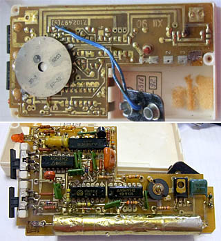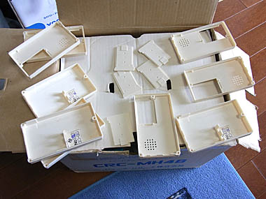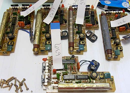 もうね、ケースの中があっちこっちベッタベタで黒い粉とかふいてたり実に気持ち悪いったらありゃしません。当初想像していた以上の完成度の高さに敬意を表し、大変気に入ったこともあって、全数水洗いする覚悟を決めて、全部分解してみたら面白いことを発見しました。いろんな種類のGM管が使われています。 シールド付きガラスGM管や、SBM−20、なんだかわからない謎のGM管等々・・・ そうそう、動作試験した際に1台どうも具合の悪いヤツがあったので、GM管の不良かと思い、分解ついでに手持ちのCTC−5と交換してみたのですが、具合はよくならず。どうも電子回路のどこかが病んでいる様子です。後々治してあげることにしましょう。