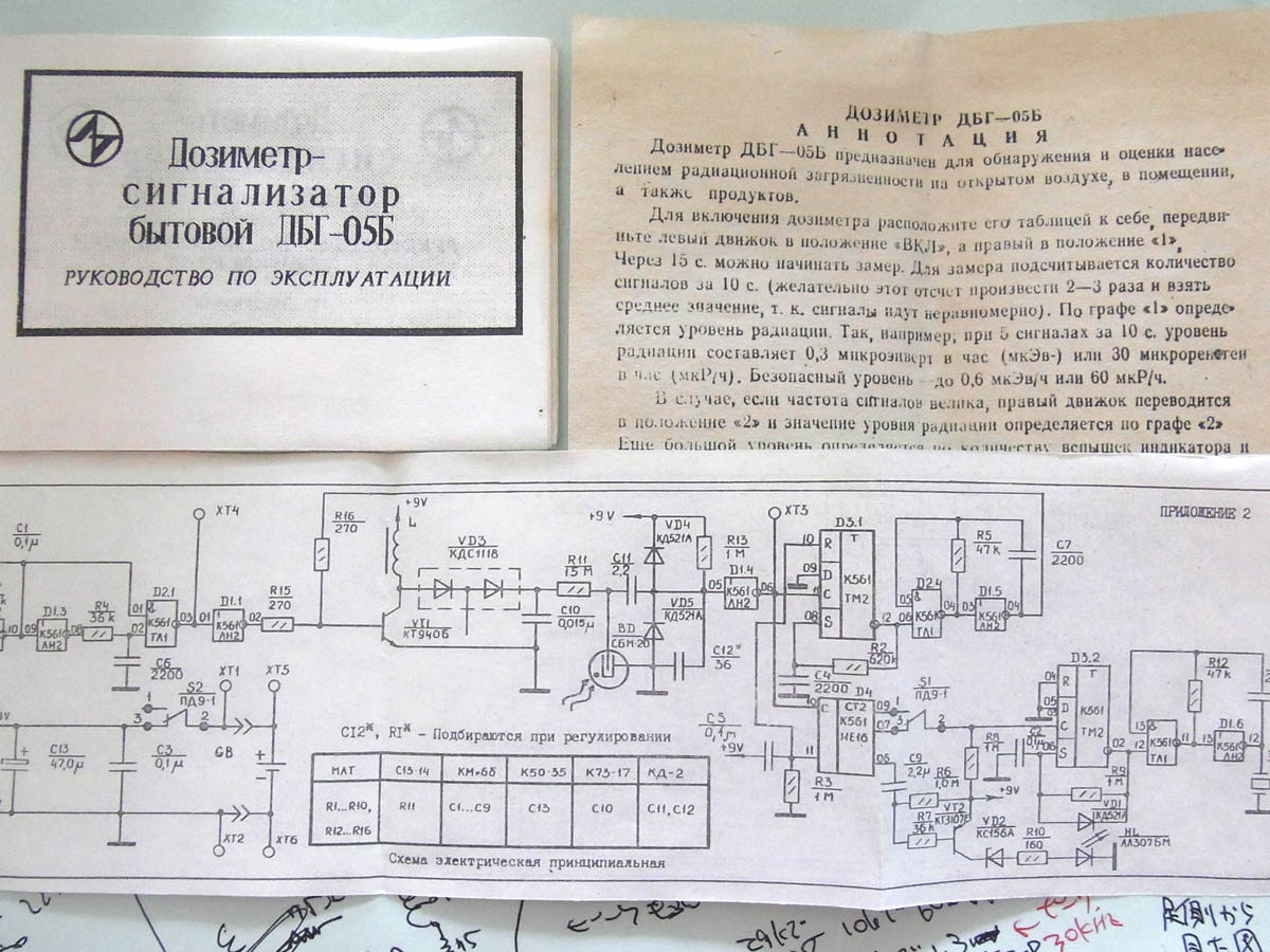 ちなみに梱包ですが、しっかりcombineされてやってきました。まぁいいです、いいですよ。この程度のことで目くじらを立てる私ではありません。 確かに使われた形跡は無く、新品っぽいです。しかしやはりかなり安っぽい質感。超安いトランジスタラジオって言ったらいいでしょうか。落としたら粉々になりそうなプラスチックケースです。 取説や回路図も入ってますが、記述言語が謎で全く読めません。回路図は、想像していた以上に複雑な構成ですが、電子部品の記号がこれまた謎で全容がわかりません。そもそもこれの機種名、なんていうのでしょうか? 読めません。 ひとつひとつにシリアル番号が手書きで書いてあって、検査印も押してあります。これによりますと、1992年製のもののようです。 電池(006Pの四角い9V電池)を入れて電源を入れてみますと、いきなり「ぴっ、ぴっ」と、バックグラウンド放射線を拾っては音を出してくれます。なかなかいいんじゃないですかね、これ。私がこちらで書いた、まさに必要最低限度の機能を持ち、かつ、信頼できる値を知ることのできる線量計の条件を満たすものです。 使い方は極めて簡単で、上部にある2つのスイッチのうち片方が電源スイッチ、もう片方がモード切替のスイッチです。 モードは、2モードあって一つが低線量(0.05〜1.2マイクロSv/時)、もうひとつが高線量(0.5〜9.6マイクロSv/時)です。