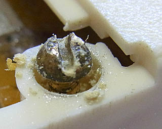 早速1台分解してみます。 しかしですね、この写真のようにネジがなにかこうベタベタしたものが上から塗ってあって実に嫌な感じです。これなんなんだろう。封印してあったものが溶けてベタベタになったのかなぁ。あとでまとめて掃除しよっと。電池のクッション用のスポンジもどろどろベタベタに劣化してます。これもエタノールで綺麗に溶かし取らないとな。