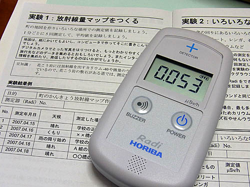 代理店の人:「今超品薄なんですよぉ。急ぎますかぁ〜」 私 :『全然急ぎませんので、必要なほうに先に回してくださ〜い』 みたいな感じでしたので、当分来ないかと思っていたのですが堀場製作所さんも4月下旬からフル増産体制になったとのことで、なんとか予定通りにやってきてくれました。 我が部屋ではバックグラウンドで120cpmぐらい(ピピピ音を数えた)。さすがシンチレーション検出器です。PA-1000はフォトダイオードですので光電子倍増管に比べれば検出率は大きく劣るものの、それでもGM管の10倍以上の検出率はあります。 数値もGM管より低めに出るようです。純粋なガンマ線のみだからかな。だいたい0.05マイクロシーベルト/時ぐらいですね。 実はこれ、2012年度から中学校理科で導入予定の放射線教育用教材に指定されているもので、それを意識してか、取扱説明書が実に分かりやすいです。 レクチャーコーナーもあって、はじめの実験が、「実験1:放射線量マップを作る」です。これはまさに放射線から身を守るために、はじめにしなければならないことです。 この取扱説明書は2008年に作られたもののようですが、なんとも今のご時世、これが学校教育ではなくいきなり実戦発動されることになろうとは、思いもしなかったでしょう。 なお、紙1枚の注意事項が付帯されており、それには、『本機を放射線量の安全性や危険性の判定には使用しないでね』という意味の注記がなされております。 あくまでも自然放射線を測定するために作られたものなので、線量当量換算が自然放射線対象になってるし、生命に関わるような用途は想定外だよってことなのでしょうね。