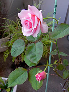 つい先ほど、雨が降ってきました。今日は夕方のお散歩は、中止かな? ところで先日、朝、いつものようにベランダにある鉢植え達を見ていたら、薔薇のつぼみが膨らんできていました。この薔薇、もう買ってかれこれ何年経つんだろうか。7年ぐらい経つのかなぁ・・・はじめのうちは毎年丁寧に追肥とか土の入れ替えとかしていたのですが、ここ数年、すっかりもう放置状態。薔薇って、綺麗な花を咲かせるためには手がかかるって話をよく聞きますが、本当にここ数年はすっかり放置状態で、数日に一度の水あげしかしてません。 雑草も、もうぼうぼう生えていて、鉢の上はまるで別の植生になっています。 こんなんでも毎年綺麗な花を咲かせているわけですから、薔薇って、言うほどヤワではなく、案外大自然のなかで強くたくましく生きてゆく植物なのかもしれません。ちなみに去年は、5月25日に咲いていました。一昨年は11月10日。その前の年は5月1日。咲く時期が随分ばらばらですが、ロクに面倒みていないから、こんなことになっているのかな? あれ〜、でも以前、ちゃんと追肥したり土変えたりしていたときには、毎年春と秋の二度咲いていたように記憶しているので、これ、放置状態が原因で年に一度の開花になっちゃったのかもしれません。