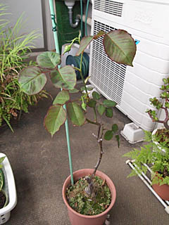 つい先ほど、雨が降ってきました。今日は夕方のお散歩は、中止かな? ところで先日、朝、いつものようにベランダにある鉢植え達を見ていたら、薔薇のつぼみが膨らんできていました。この薔薇、もう買ってかれこれ何年経つんだろうか。7年ぐらい経つのかなぁ・・・はじめのうちは毎年丁寧に追肥とか土の入れ替えとかしていたのですが、ここ数年、すっかりもう放置状態。薔薇って、綺麗な花を咲かせるためには手がかかるって話をよく聞きますが、本当にここ数年はすっかり放置状態で、数日に一度の水あげしかしてません。 雑草も、もうぼうぼう生えていて、鉢の上はまるで別の植生になっています。 こんなんでも毎年綺麗な花を咲かせているわけですから、薔薇って、言うほどヤワではなく、案外大自然のなかで強くたくましく生きてゆく植物なのかもしれません。ちなみに去年は、5月25日に咲いていました。一昨年は11月10日。その前の年は5月1日。咲く時期が随分ばらばらですが、ロクに面倒みていないから、こんなことになっているのかな? あれ〜、でも以前、ちゃんと追肥したり土変えたりしていたときには、毎年春と秋の二度咲いていたように記憶しているので、これ、放置状態が原因で年に一度の開花になっちゃったのかもしれません。