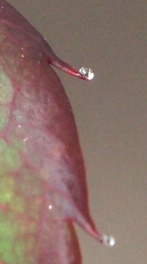 薔薇の葉っぱって、外周部に棘がつんつん出ているのですが、ここもよく見ると、水滴が付いていて実に美しいです。 これ、水をあげたわけでないので、葉っぱの内部から浸出してきているのでしょうね。 写真には撮れなかったのですが、この水をアブラムシが吸いに来ています。 アブラムシの世界は、どんな様子なんでしょうか。 みんな仲良く平和に生きているのかな。