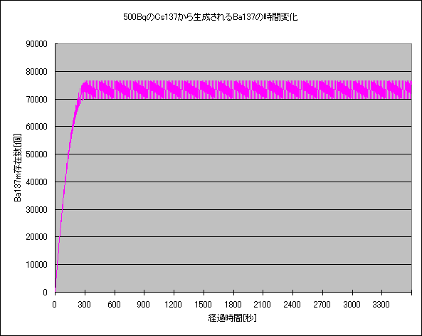 ■諸々のこと・・・ 1kgの食材に500ベクレルのセシウム137が入っていたとします。 500ベクレル=1秒間に500回の核分裂が起きるだけのセシウム量ってことです。 すなわち、1秒間に、バリウム137mが475個(500x0.95)生成されるわけです。 バリウム137mは2.5分で半分になるので、10分も経てばほとんど全部が崩壊していると考えてOK。 と、いうことは、どうなるんだ? う〜、実にややこしいぞ。 このへんで前回は挫折・・・ 1秒間に475個生成されるバリウム137mは、10分間でほぼ全部無くなるのだけど、今現在も常に毎秒475個供給され続けているわけだから、バリウム137mは一体何個あることになるのだ? あ”〜〜〜、ややこしい。 きちんと考えれば計算できるのだろうけど、面倒なのでC言語で簡単なコードを書いて実際に時間経過に伴うバリウム量をシミュレーションしてみました。ビバ・力技!