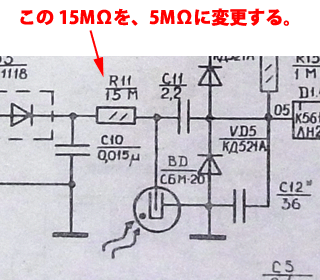 まず仕様の確認ですが、この謎の線量計に使われているGM管は、SBM−20と謎のガラスGM管。たぶんこのガラスGM管も、ロシアンGM管の代表格であるSBM−20の仕様に準拠してると考えれば、推奨アノード抵抗は、5.1MΩということになります。ところがこの回路図のように、何故かこの謎の線量計では、アノード抵抗15MΩと、3倍も高い値で駆動されています。なんでこんな高い抵抗で駆動されているのかな〜〜 GM管の寿命を考えてのことでしょうか。でも、5.1Mで駆動しても寿命は2x10の10乗パルスカウントですから、1μSv/時の線量下で連続稼動させても100年以上の寿命があります(計算上は190年!)。全然無問題なので、ここは具合の悪い線量計のアノード抵抗を、5MΩに換装することとします。