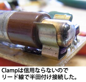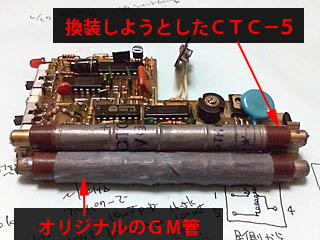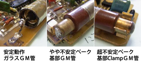 具合の悪い原因はこちらで推測したとおり、日本の高湿度環境下でGM管にかかる高電圧がリークしているのでは無いか? というもの。特に、GM管は高インピーダンスで駆動されるので、非常に高電圧リークしやすい条件で稼動していることになります。 この写真には3種しかありませんが、その後よくよく調べてみると5台買った線量計には、都合4種類のGM管が使われていました。かなりバリエーションがあるようです。うち、ガラスGM管(5台中2台うち1台は修行の旅に出した)は半田付けで接続されていて非常に安定して動作します。これは安定しているのでこのまま手を入れずに使います。 次に、基部ベークライトであるものの半田付けで接続されているGM管(5台中1台)は、やや不安定で、部屋を除湿すると安定稼動するという状態。これは、駆動インピーダンスを下げると安定動作する予感が激しくしますので、アノード抵抗5MΩ化します。 さらに、基部ベークライトでClamp接続されているGM管(5台中1台)は、入荷直後から非常に不安定で狂ったように「ぴぴぴぴぴ」と鳴り続けたり、全く鳴らなくなったりです。湿気の影響もさることながら、GM管自体もなんだかくたびれているような感じがしますので(自作テストベンチで連続稼動させているとガンマ線を突然カウントしなくなる)、アノード抵抗5MΩ化の上さらに手持ちのCTC−5と交換します。 そしてもう1台、アノード側がガラスで半田接続なのに、カソード側がベークライト基部でClamp接続というまさにSBM−20とガラスGM管の過渡期のようなGM管があるのですが、これも安定して動作していますのでこのまま手を入れずに使います。 こうしてみるとガラスGM管が、日本の高湿度環境下には向いているのかな? ガラスだから高湿度環境下でもリークしにくいんでしょうね。
