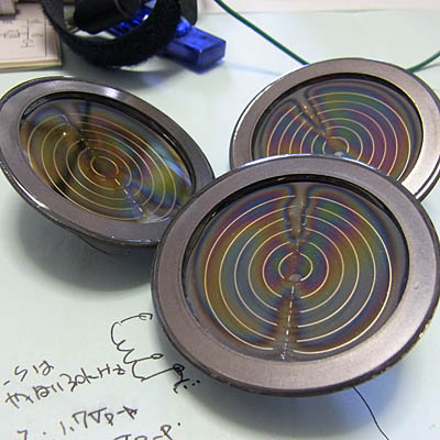 そんなわけでちょうど今日も、この具合の悪い線量計を基板むき出しのまま「ピッピピッピ」鳴らしてましたので、このパンケーキGM管の動作チェックをすべくGM管を外して、パンケーキを付けて鳴らしてみることにしました。 まずは取り出してみます。光り輝くマイカ窓が実に美しい。 そしてこのGM管、とっても良い音がするんです。GM管同士がぶつかると、なんていうんでしょうか、ガラスで出来た繊細な風鈴のような、『シャランシャラン・・・』という、実に綺麗で涼しい、繊細な音がします。あんまりぶつけ合うとどう見てもよくなさそうですが、ついつい『ぉおいい音』とか言って、お互い優しくぶつけ合ってみたりして。 早速蓑虫クリップ配線で、鳴らしてみます。いやぁものすごく反応いいです。バックグラウンド比でCTC−5より倍ぐらい拾っている感じ。 『おいおい、俺の部屋はそんなにアルファ線やベータ線だらけなのけ?』と、若干の恐怖を感じながらも3個とも動作OKでした。 パンケーキGM管はガンマ線感度は普通のものより低く、アルファ線とベータ線の検出を目的としています。いろんなものの表面汚染検査に適しているGM管なんですが、これを使ってなんとか食材の汚染の見当ぐらいは付けられないかなぁ・・・って、思って、このたび入手してみたのです。 このGM管は、10万円以上する表面汚染検出用サーベイメータに使われているものと同じかそれ以上の性能を持っているものですから性能的には問題ないハズ。 お値段も、実に高かった。と言っても、1個1万円ちょいx3+送料 ですが。1個当たりの値段で比較すればSBM−20やCTC−5の約5倍ですね。 ボチボチと実験しつつ、研究して行きましょうか。