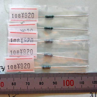 やはり線量計をあーだこーだいじっていると、GM管にちゃんと規定電圧が印加されているのかどうか、どうしても確認したくなります。 ところがここ、超ハイインピーダンス駆動されている系ですので、普通にテスターで当たってみても、当然ですが電圧降下を起こして正しい電圧を測定できません。 そこで、ハイインピーダンスプローブを作ろうと思ってですね、手配していた 1ギガオームの抵抗器 が、本日納品されました。写真がそれです。 普通の1/4Wタイプの抵抗なんですけど、なんと1本920円! おいおいですよ。なんだよこの超高額抵抗は。私はオーディオアンプ作るときだってこんな高価な抵抗を使ったことありません。920円つったら、あと10円足せば私がよく食べる立ち食いわかめ蕎麦3杯分ですよ。しかもこれをなんと5本! 920x5=4600円! ちょっとしたコース料理が食える金額ですぜ。 ま、仕方ありません。研究開発に投資は必要です。 1ギガオームなんて言ったら、普通に手に持って指紋が付いただけでももう800メグオームぐらいになっちゃいそうなレベルですから、扱いは極めて慎重に行う必要があります。 で、まずは、この1ギガオーム抵抗器を、GM管に並列に繋げて線量計を動かしてみます。もし、これで正常にカウントされれば、まずは第一段階はクリア。これで正常にカウントされなければ、電圧降下でプラトー域からドロップしたと考えられますので、失敗です。 結果・・・見事失敗! まるでカウントしません。 くぅ〜〜〜、1ギガオームでも駄目なんですか。ぁあそうなんですか。 内心『1ギガオームならいけるだろ』と思っていただけにかなり凹みます。ここは、取りあえず全部直列に繋いで5ギガオームでトライすべきところですが今日のところはここまでとします。 それよりも、1ギガオームのリークでもう動作しないってことだと、ほんとガイガーカウンターって湿気に注意しないと、まずいですね。 _ 備忘録:パンケーキ型GM管のガンマ線計数率について。(14時04分記)先日納品されたパンケーキ型GM管。パンケーキ型GM管のガンマ線感度は通常のGM管に比べると劣ると一般的に言われているのですが、実際どんな感じなのかを本日調べてみました。