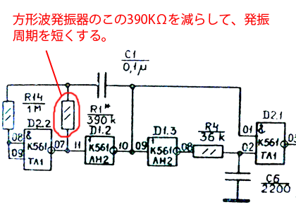 昨日の計画通り、高電圧回路の湿度リークにめげないだけの駆動能力を確保すべく、本日改造作業を行いました。 アイドリング時に昇圧回路に電力を供給するパルス発振器の周波数を上げ、コンデンサへのチャージエネルギーを増やすという作戦です。 これが、パルスの元になる方形波発振部です。図中にある390Kオームの抵抗値を下げることで、発振周波数を上げてみます。現在だいたい11Hz前後(90ミリ秒周期)で動いているのですが、これを、まずは倍の20Hz程度にしてみます。