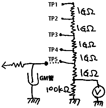 今回は、GM管印加電圧がプローブ当てることでドロップする前提で計画を立てました。左図のように、1Gオームの抵抗を5本と電圧検出用の100Kオームを直列に繋ぎ、GNDをGM管のGND側へ、TP1〜TP5を順次GM管のアノード側に接続し、それぞれのTPで、100Kオーム両端の電圧を測定します。 これよりGM管駆動高電圧ラインのインピーダンスを求めて、GM管無負荷時の印加電圧を推測するという方法です。 電圧観測にはアナログオシロ(x10プローブ)を用い、1mS/Div、1mV/Divレンジで目視しました。 実験結果です。