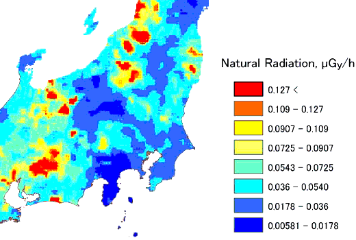 「AIST 海と陸の地球化学図」の「日本の自然放射線量」の図より一部切り取り引用させていただきました。