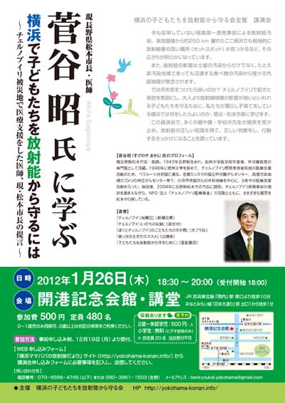 2011-12-24 クリスマス・・・_ ご案内:「横浜で子どもたちを放射能から守るには」(13時40分記)現、長野県松本市長であります菅谷昭(すげのや あきら)さんの講演会が、2012年1月26日(木)18時より、みなとみらい線日本大通り駅近くの開港記念会館で行われます。 菅谷市長は医師でもあり、チェルノブイリ原発事故被災地の医療支援活動のため1996年にベラルーシ共和国に渡り、自ら被災地で多くの人々を診られた経験をお持ちです。 3月12日の福島第一原発爆発事故に際しても、いち早くその危険性を松本市から発信するなど、被曝を少しでも防ごうと精力的に活動されております。 そんな菅谷市長の講演会「横浜で子どもたちを放射能から守るには」が、このたび横浜で催されることとなりました。 本講演会の詳細は、リンク先のpdfをご覧ください(別窓で開きます)。 事前予約制で、すでに保育・テレビ室は定員に達してしまいましたが一般席はまだ大丈夫です。 ここ横浜でも、実は身近に迫っている放射能へどう向き合えばよいのか、不安を感じられているかた、正しい情報を知りたいを思われているかた、この機会にぜひ。
