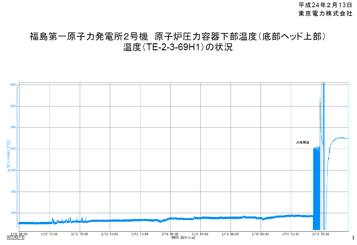 _ 久しぶりの福島第一原発ネタ『ぶっ壊された温度計?』。(14時38分記)最近あえて触れないようにしていた原発放射能政治ネタ。特に理由は無いのですが、まぁ、あえて言うなら諦めですかね。まぁ、まとまって書くだけの時間が無かったってこともありますし、地域ローカルな放射能対策活動に参画しているってこともあって、かにの泡ぶく に書くよりも、しばらくの間は、実際に行動することで地域貢献することにしよう・・・と、思っていたりしたこともあったり。 というわけで、久しぶりの福島第一原発ネタです。 福島第一原発2号機の温度計の一つが上昇傾向を示し、もうすぐ冷温停止状態から逸脱するかもよ? と騒がれだしたのが今月上旬。で、東電は、同じ高さに3つある温度計のうち、他の2つは温度変化していないので『故障の可能性もある』とかいいつつ、2月7日の早朝0時すぎからホウ酸1トン注入。わざわざこんな真夜中にホウ酸1トン投入なんて、かなり緊急性が高かったのではないかと思わざるを得ない慌てようです。 熱電対温度計って私も大学のときによく使いましたが、故障するときはオープンモードで故障することがほとんどなので、計測温度が振り切れることこそあっても、あんな風に「じわじわ」温度が上がっていくような壊れ方は、考えにくいなぁと思っていたのです。 で、昨日の東電発表によれば、当該温度計はその後計測温度が振り切れ、点検の結果、壊れていたことが明らかになったとのことでした。 が、東電発表のこのpdfを見てください。リンク先はオリジナルですが、消されるとイヤなので左画像は、pdfを画像化したものをローカルでリンクしてます。それまではじわじわと温度計測していた温度計が、東電の点検によってまるでぶっ壊されたような挙動になってしまっています。 東電によれば、点検は「2月13日午後2時2分から午後2時54分まで当該計器の調査を実施。」ひょっとして点検で、わざとぶっ壊した? わざとじゃないにしても、点検でぶっ壊したようにしか見えないのですが・・・