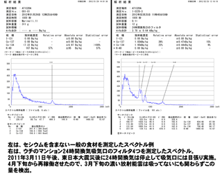 2012-02-29 うるうの日:大雪。_ 24時間換気フィルタのセシウムを測ってみた。日本全国かにこむを贔屓にしてくださるみなさまこんばんは。 いやぁ今日は、本気で雪降ってましたね。ここ横浜の地も、結構積もりました。 ほんの数センチの、ちょっとした雪ですが、それにしても白銀の世界というのはやはりいいものです。こういう風情を感じられるってことは、本当に幸せなことなんだと、思います。 さて今日は面白いデータをご紹介しましょう(って、今すぐ他に書けるネタがないので ^^))。 私の住居は4LDKのマンションで、24時間換気設備があるのですが、この、24時間換気の吸気口についている、直径8cmぐらいかなぁ・・・の、フィルタの放射性物質を測ってみました。 毎年年一回、大掃除のときに交換しているのですが、いつもは捨ててしまうこのフィルタ、去年末の大掃除のときには、『もしやこれは放射性廃棄物か?』と思い、捨てずにとっておいたのです。 使ったベクレルモニタは、ATOMTEX社のAT1320A。スクリーニング機ですのでその点ご留意を。 結構しっかり出てます。 ちなみにウチは、2011年3月11日の東日本大震災発生後、福島第一原発全電源喪失の報を夕方受けた直後に24時間換気は停止し、換気口に目張りしました、 24時間換気を復帰させたのは4月の下旬、空間線量が落ち着きはじめたころです。よって、3月15日前後、21日前後に関東地方を襲った「濃ゆい」放射能雲を、このフィルタは吸ってません。 にもかかわらずこれだけ明確に検出されています。Cs137とCs134が、しっかりでてますね〜。 このフィルタは、線源として大切に保管しておくことにしましょう。 [ツッコミを入れる]