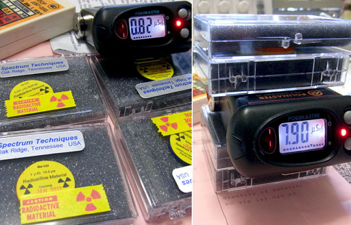 2012-02-03 鬼とも仲良くしよう・・・_ 密封線源。(10時44分記)放射線測定器の実験をしているとやはりどうしても、基準となる線源が欲しいというか、必要になってきます。 今まではトリウム石(表面線量 10 μSv/h)とか、閃ウラン鉱(表面線量 220 μSv/h)を使ってやっていたのですが、ここはひとつちゃんとしたのを手元においておこうと思い、密封線源を海外のメーカーに発注していたのですが、それが昨日届きました。 一時はEMSトラッキングで「通関保留中」「税関から通知書発送」などと表示されて『やっぱ非核三原則にひっかかったか?』なぞとひやひやしましたが、無事手元にやってきました。 セシウム137が3個と、バリウム133が1個の、合計4個です。 これである程度きちっとした、放射線源が確保できました。 これあると、放射線検出器の実験をしていても、なんだか安心しますね。 写真で言うところのマクベスチャートみたいなものでしょうか。